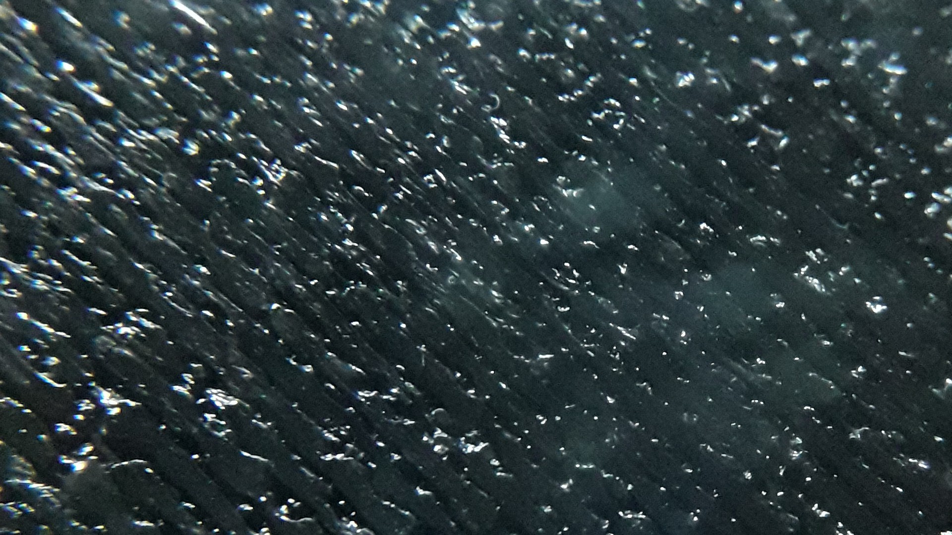 Mint látható a nagyított képen, a szálak közt üres helyek vannak. Ez 1mm-es fúvókával készült, egybefüggő sima lap, mondjuk hogy egy doboz alaplemeze. Hasonló barázdák vannak a sorok közt mint a hanglemezen. Üveglapra 50°C-os asztalon 210°C-os fejjel készült, sima PLA anyag. Eldugulva nincs, üresjáratban akadás mentesen nyomja az anyagot. A szeletelés RepetierHost-ban CuraEngin-el készült, rétegmagasság 0.2mm. De ha az oldalfalat megnézem, ott is feltűnik ez a szál hullámosodás.