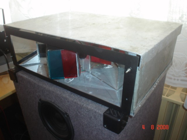 Az nem üveg hanem tükör és nem háromszöget csináltam hanem négyszöget vagyis kockát 7*7*7 cm-es. Azért kocka lett, hogy több színt tudjak használni, minden oldalon 2-őt, így jön ki a 8. Csak annyiból áll, hogy a tükrökre színfóliát ragasztottam. Elég jó a színe és fényereje. Hát megépítési rajz? Az végülis nincs. Nézegettem eredeti fényeket + már nem ma kezdtem + sokat kell kísérletezni (lencsebeállítás) + nem szoktam dokumentálni, hanem csak úgy "összevissza" mindent papírra vetek és abból lesz a kész cucc