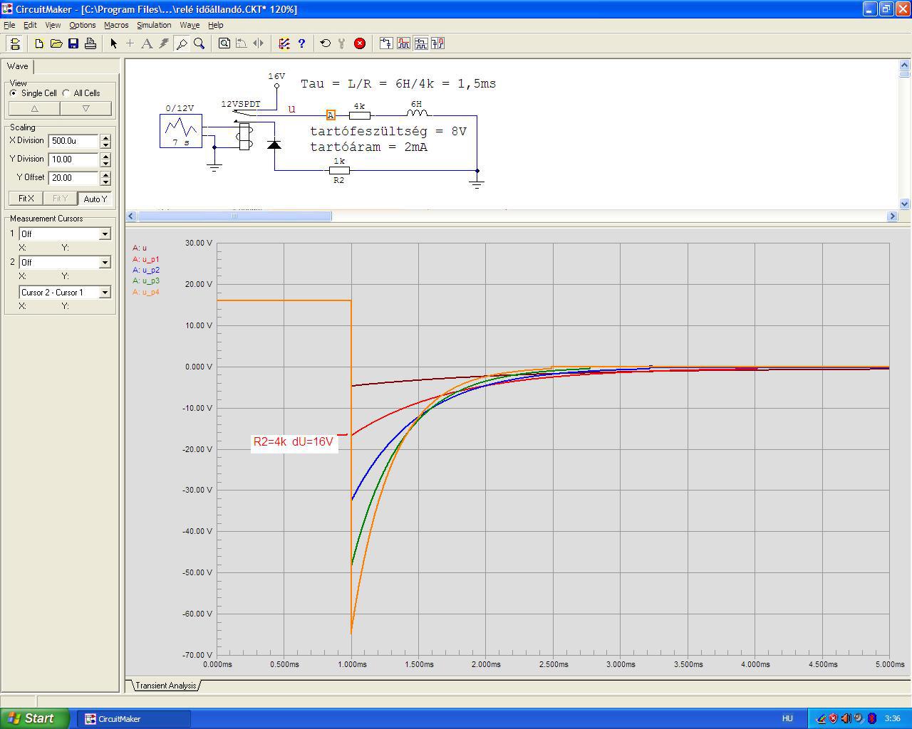 Magyarázatképpen: a szimuláción az a 12VSPDT relé nem az a relé amiről a szimuláció szól, az csak egy kapcsoló, amely lekapcsolja a relé tekercséről a feszültséget. Tehát ez ne tévesszen meg senkit. A szimulált relé a 4k-os ellenállás és a vele soros 6H-s induktivitás. Annak a 48V-os relének a paramétereit szimulálom amit itt használni fogok. Persze ebben van egy kis bibi. A nyitott érintkezőjű relé induktivitását mértem, így 6 Henry. Ha záródik a mágneses kör ez az induktivitás nyilván nagyobb lesz... de, hogy pontosan mekkora ehhez vagy szét kellene fűrészelnem egy relét és megmérni (de sajnálom feláldozni), vagy meg kellene mérnem és visszaszámolni (erre meg lusta vagyok). A kikapcsolási idők arányai ezekkel az értékekkel is szemléletesek, de a gyakorlatban nyilván nagyobbak lesznek.