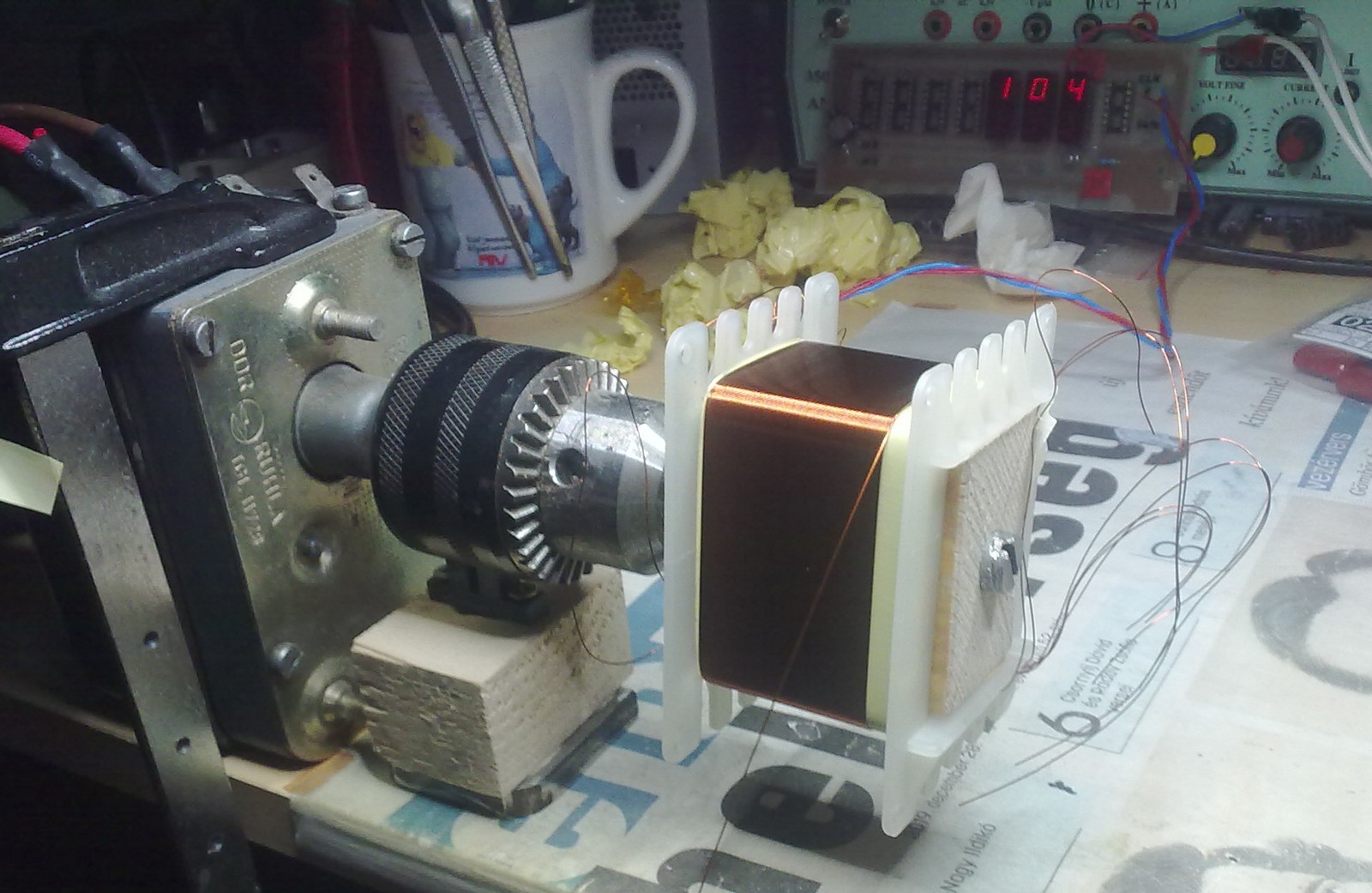 Idézet: „ ... egy hálózati trafó, oda tettem még a kapton alá egy réteg papírt is a primer-szekunder közé hogy látszódjanak a menetek de amúgy nem kell. ”