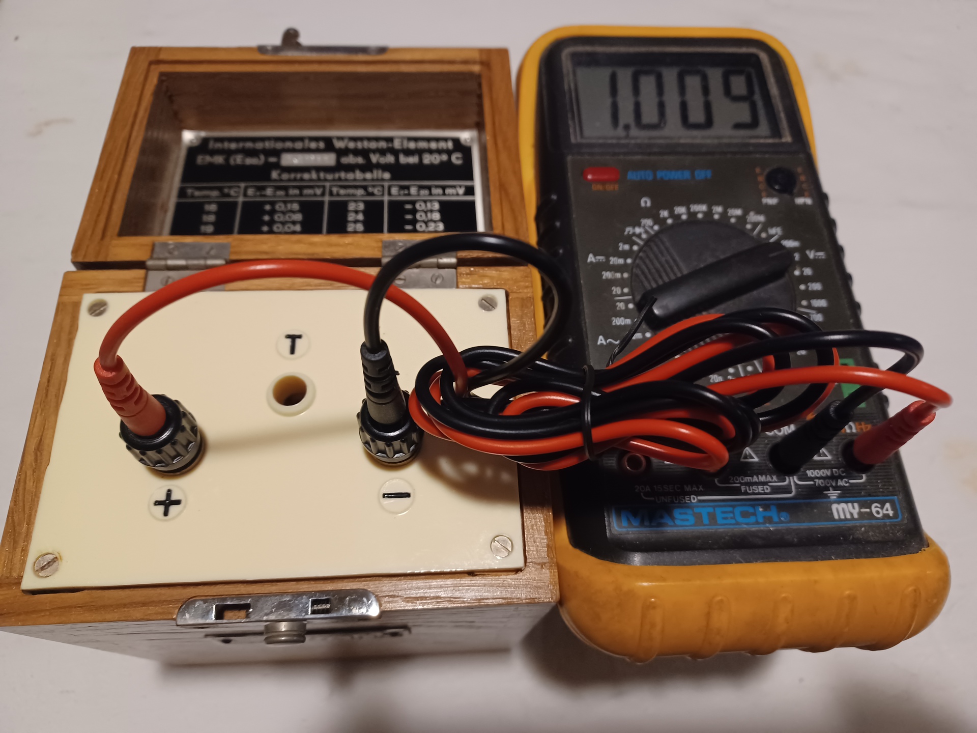 10 megaohm belső ellenállású multival még nem terheled túl, de persze nem kell rajta felejteni. 20 fokon 1.0183V mért feszültség alatt a cella már nem az igazi úgyhogy reméljük csak a multid nem mér pontosan. Ez egy telített cella amúgy, ami szerintem értékesebb mint egy telítetlen: bár rosszabb a hőmérsékletfüggése viszont nem veszít idővel a feszültségéből mint egy telítetlen. A belsejét is lefényképezhetnéd. A telített cellák emlékeim szerint "nem hordozhatóak" ami azt jelenti hogy ne döntsd meg 30 foknál jobban egyik rányba se, és főleg ne fordítsd fel (bár lehet készült belőlük hordozható is).