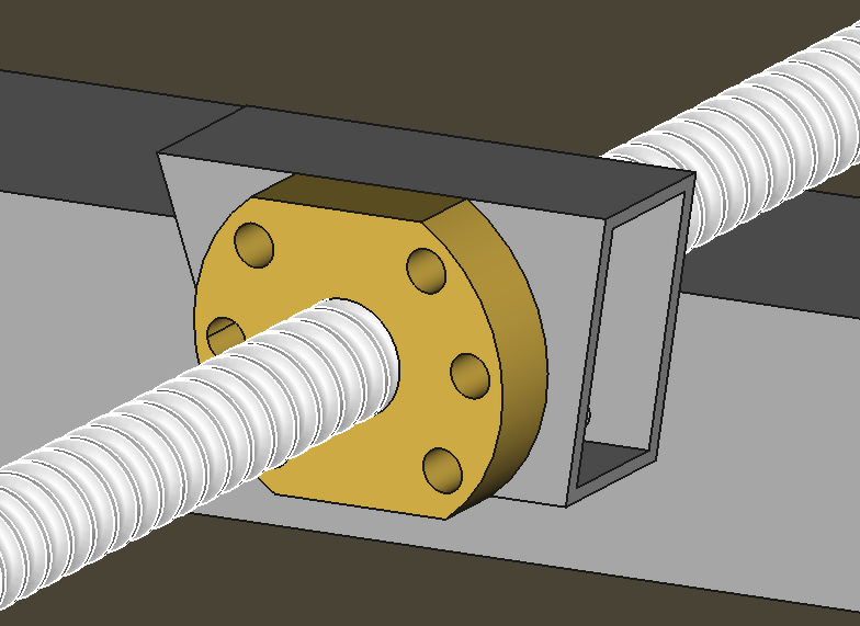 1. A menetes tengelynek abszolut párhuzamosan kell lennie a vezetö sinekkel. Ezt valahogyan be fog kelleni tudni állitani. Ezt csak akkor tudod elvégezni, ha már kész a keret a kocsi meg a sinek. Azaz a tengelycsapágyakat ugy kell valahogy szerelni, hogy azt állitani lehessen. 2. A kocsi kapcsolatát az anyával ugy kell megoldani, hogy annak munkairányban ( a menetes tengely hosszirányában) ne legyen semmi játéka, rugalmassága és ezt hosszu távon garantálni kell. Az egyetlen játék az anya és az orso között lehet, amit a szoftware kompenzálhat ( mennyi a hiba az irányváltáskor). Házi körülmények között a te esetedben az lehet a legjobb megoldás, ha a szerkezeten kialakitasz 3 vertikális sikot ( 2 a kereten 1 meg a kocsin). Ezek tartják a hosszirányban a lehetö legmasszivabban a 2 csapágyat valamint az anyát. Ezek lehetnek hegesztve, vagy csavarozva, de a lyukaknak vizszintesnek kell lenniük. (Azaz pl nem a szerkezet aljára, tetejére csavarozod hanem az oldalára.) A csapágyokat meg az anyát rögzitö furatokat kissé nagyobbra kell késziteni, hogy be tudd állitani a 3 elem pontos helyét a hossztengelyhez képest vertikálisam meg horizontálisan.