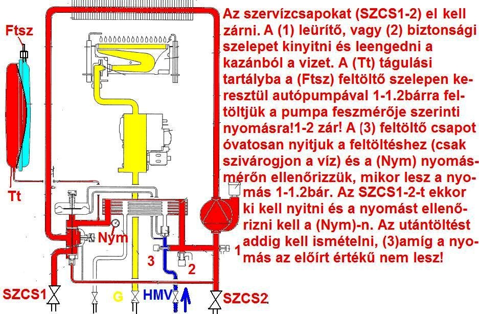 Szia! Szerintem első körben a HMV NTC-t kellene kimérni, hogy megfelelő e az értéke az adott hőmérsékleten. A másik dolog a szelepváltó motorja csinálja e a váltást vagy nem tudja átváltani az üzemállapotot ezáltal nem jut megfelelő teljesítmény a másodlagos hőcserélő primer oldalába amit amúgy is túlhűt a téli 8-10fokos hálózati víz. A harmadik, hogy milyen redszeren üzemel a kazán, mert ha vasiszapos hordalék kerül a lemezes hőcserélőbe akkor ugyan ez a helyzet, hogy nem lesz kellően meleg a HMV. A tágulási tartály nyomásbeállítás ITT van leírva. Csak a leeresztő csapot használd ne a biztonsági szelepet, azt csak én odaírtam ha valaki nem találná a leeresztőt vagy az nincs a készüléken. Nekem az a meglátásom, hogy a tágulási tartályod lyukas a ballonnál ami magába ereszti (a légterébe) a rendszer vizét és ahogy kiegyenlítődik a nyomás és hűlik majd a víz leesik a nyomás is. Ezt addig lehet folytatni amíg meg nem telik a tágulási ahonnan már nincs hová tágukjon a rendszer vize így a biztonsági szelep kinyit. Ha a tágulásit cserélni kell nem muszáj belevalót venni de legalább olyan térfogatút hozzá azt igen, amit el lehet helyezni a kazán mellett flexibilis bekötővel bekötve.