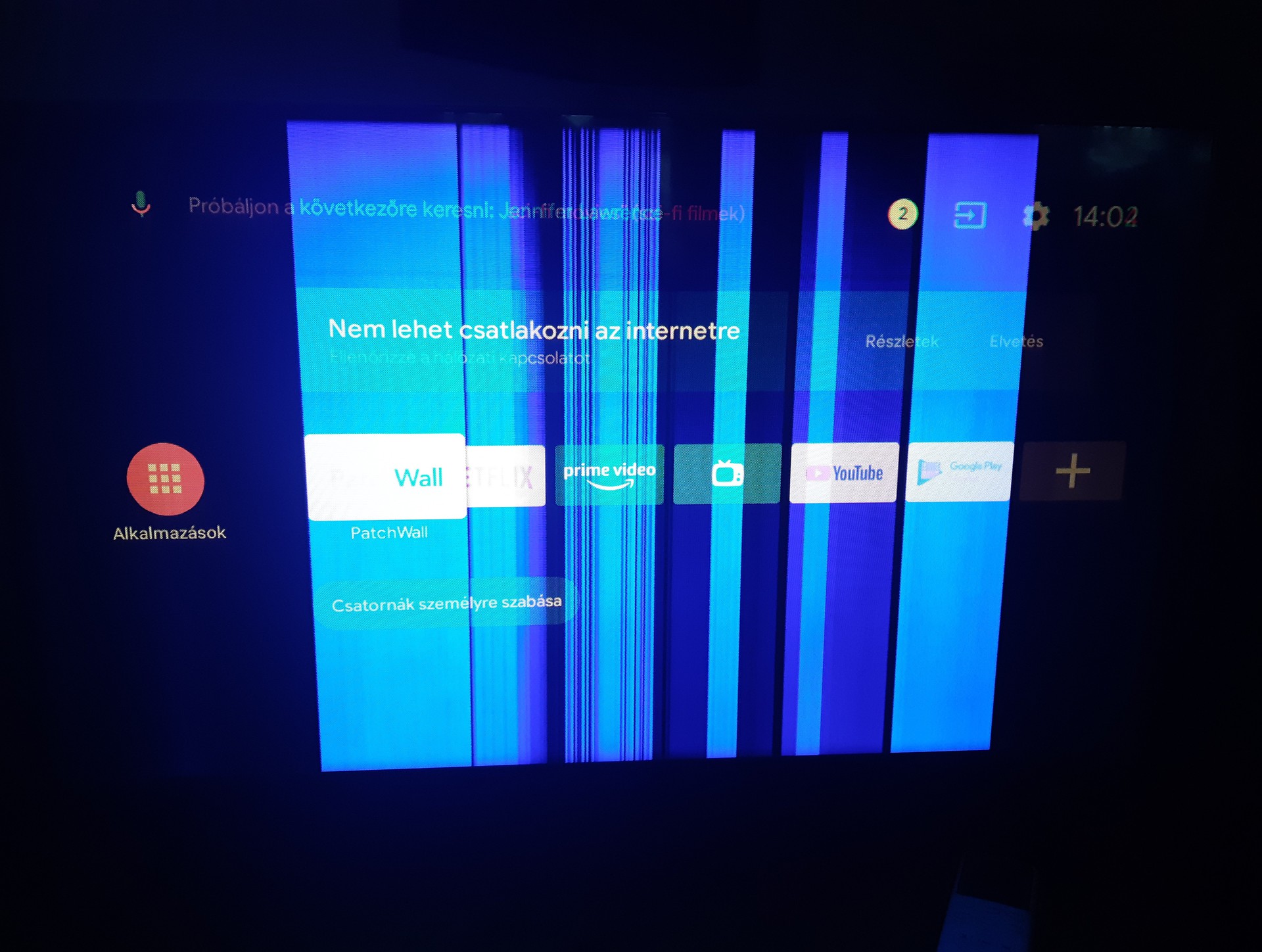 Kaptam egy xiaomi l32m6-6aeu típusú tévét, ami a képen látható hibát produkálja. Bekapcsolás után csak vörös szín látszódik, majd megjelennek a csíkok, és a színek is előjönnek, bár torzak. Ki-be pattintottam a szalagkábelt ami a mainbord és a tcon között van, de nem segített, csak annyit, hogy lettek színek, előtte végig vörös volt. Ez alaplap, vagy kijelző hiba? Javítható?