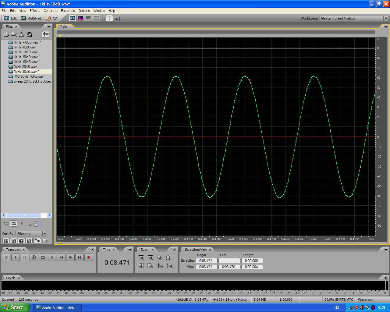 Ennek ellenére láttam egy nagyon érdekes torzítást, ami olyasmi volt, hogy a szinusz csúcsa vagy kiemelkedett, vagy beszakadt. De, hogy ennek a torzításnak hol van a minimuma az rejtély, mert hol itt, hol ott. Tehát a Denon is inkább otthagyta a potit középállásban. Aztán később még fülre is próbálkoztam a beállítással, de a végén feladtam. Most eszembe jutott ez a múltbéli kis szösszenet - a lemez még megvan - gondoltam visszaolvastatom a PC-be, hogy egyáltalán mi van rajta szinusz (helyett). Ez van rajta. A program szabályozni tudja a hangerőt, azaz a jelszintet. És beszélnek itt 100 dB-es dinamikáról... mi van ??? És felmerül az a kérdés is bennem, hogy akkor most mekkora legyen egy erősítő torzítása és melyik torzítása legyen mekkora (a tranziens vagy a harmonikus) de ez csak zárójelben.