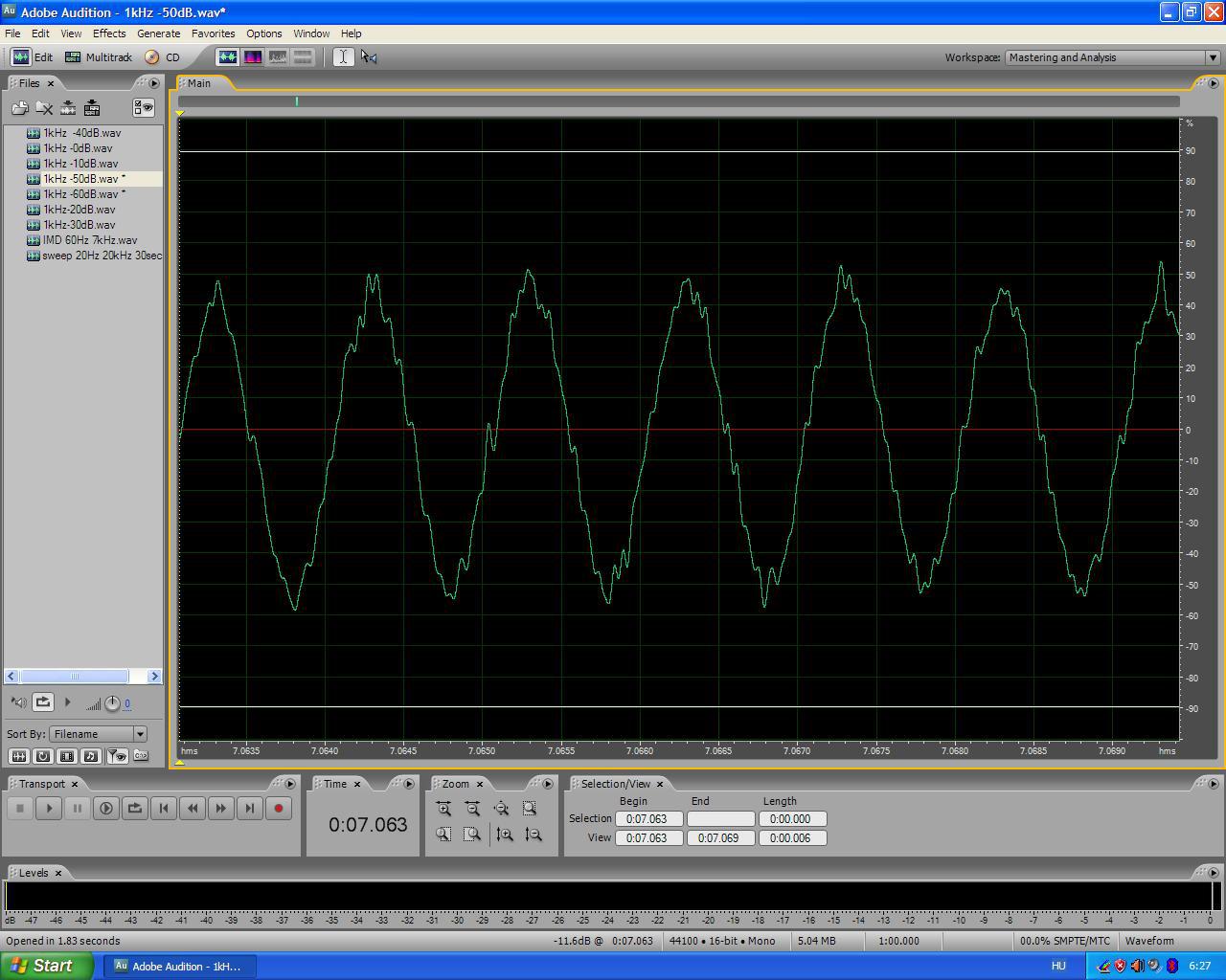 Az 1kHz -60dB úgy néz ki, mintha egy 15...20kHz körüli jel is hozzá enne keverve hullámzó amplitudóval (tehát lehetnek "oldalsávjai" 20kHz felett is, amelyek tükröződnek a hallható sávba). Megnézném FFT-vel, hogy mi ez. Viszont ha tényleg ez van a lemezen, akkor nem kell csodálkozni a CD játszó kimenetén sem. Az az audiolabs tud működni DAC-ként is, én kipróbálnám a helyedben, hogy PC-ről meghajtva is. Ha windows-t használsz akkor Foobar2000, és ASIO driver (ha van ehhez) - ami kikerüli a windows hangkeverőjét, mert az is visz be hibákat. A windows 32 bites lebegőpontos számokkal dolgozza fel a hangot, viszont a DAC (és a felvételi is) fixpontos matekkal dolgozik, az oda-vissza konverzió pedig vihet be hibát, torzítást, zajt. Nem vagyok egy audiofül, nem gondoltam, hogy hallható, de hallom a különbséget. Persze nem akkora különbségről van szó, hogy az egyik hallgathatatlan a másikhoz képest, de a hang alapján elég jól eldönthető, hogy melyik a jobb.