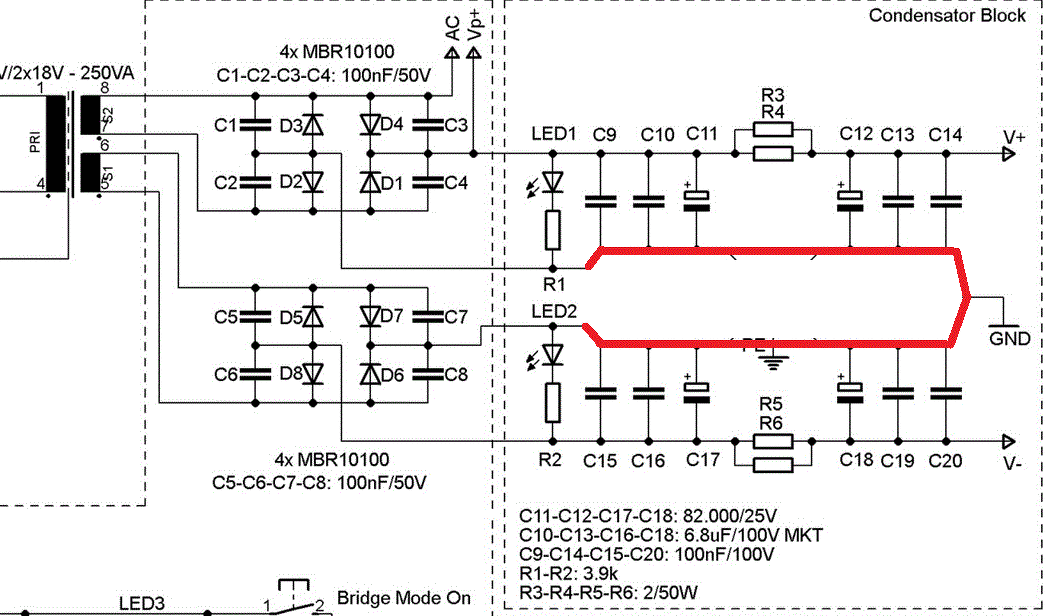 Egyetlen szempont lehet a tápegység puffer kondenzátorainak a bekötésénél - a töltőáramok és az elmenő áramok sohasem lehetnek közös vezetékszakaszon!