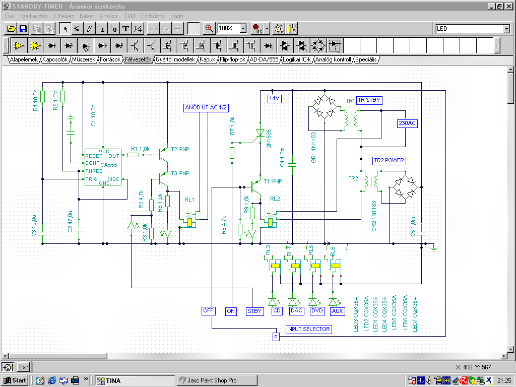 Be/ki /standby/input. 230V kapcsolása rögtön a táp trafón elhelyezett reléve , ehhez kell egy 4-5V/A-es készenléti trafó , de mindent legyszerűsít és nem kell a 230V-os kábellel kavarni az erősítő belsejében . Rajz kicsit bonyinak tünik , de nem az , csak TINA miatt lett ilyen körülményesen megrajzolva . Ha kicsit átnézed érthetővé válik . A tirisztor kapcsolja a a hál.trafó reléjét , ez az ON állás , de ha forgókapcsoló érintkezője tovább lép akkor is bekapcsolva tartja , az OFF helyzetben a T1 tranzisztor kikapcsoja a tirisztor , így 1 áramkörös forgókapcsolóval minden kapcsolás helyben megoldva, kevés vezetékkel , könnyen távvezérelhetőre is módosítható ..