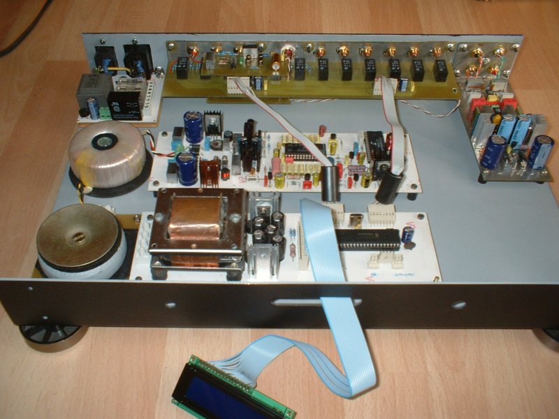 Én csináltam külön dobozba infrás hangerő és bemenet választót , elfért még bene 1 DAC is és RIAA . Sajnos ez is LCD-és kijelzővel , relés hangerővel megy , távvezérlő megtanítható vele .