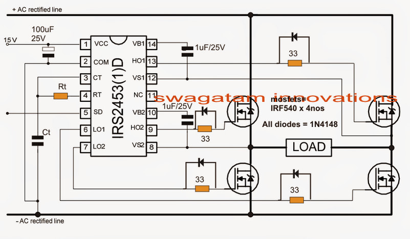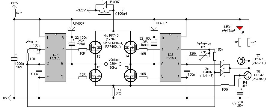 Azt szeretném kérdezni, hogy ha az alábbi rajzon a bekarikázott +325 V helyett, +60 V-os 20 kHz-es négyszögjelet kötnék akkor a H híd közepén beállítástól függően 42 V 50 Hz is lehet? Köszi előre is.