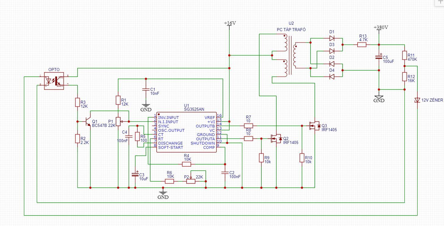 3525-tel kiindulásként csatolok egy rajzocskát. Az optocsatoló részt hozzá kell igazítani a nagyfesz részhez attól függően, hogy el kell választanod a 16 voltos résztől vagy sem, el is hagyható akár. Azt kell csak megoldanod, hogy zeneres előtéttel 380 V környékén visszavegye a kitöltést ( duty ). A frekvenciát a 6. láb potijával tudod beállítani, célszerűen 40-60 kHz közé. A fet gate-re egy 15-16 voltos zenert tegyél. Teszt trafónak első körben jó egy pc-tápos fordítva, a szekunder kör 2x12 voltos tekercs mehet az anódokra, közép a + tápra ( légréses nem jó ide ). Primerre gyors 1000 voltos diódákból graetz, elkó felé soros 4k7,.... 3-5 W kezdésnek. Az anódok és a gatek közé 1-1 soros gyors dióda-zener ( 40-45V ) lánc mehet védelemnek ( erről később, ha odáig jutsz ). A hozzászólás módosítva: Dec 20, 2024