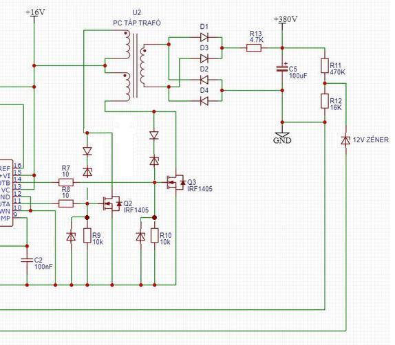 Megpróbáltam lerajzolni egybe. A IRF1405 fetek előtti 10ohmos ellenállás után tegyem be a 15V zénert sorosan? A trafó primer részénel az 4.7K sem világos hogy jó-e.
