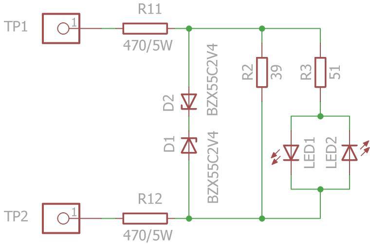 A működése gondolom egyértelmű, mérőtűk polaritása mindegy, a két led vizuális visszacsatolást ad, van-e még levezetendő töltöttség egy kondenzátorban.