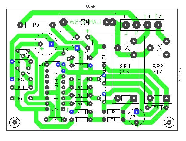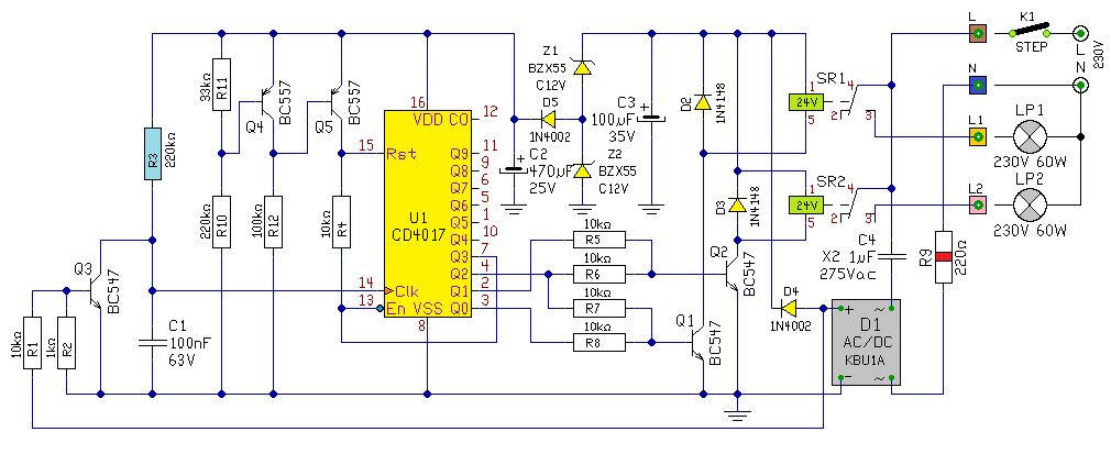 - Ha bekapcsolod a "lámpát", akkor felépül az IC tápja a 470µF-ban. A Reset most nem időzítve működik, hanem feszültségszintre. Az IC kb 3V környékén kezd el működni, viszont a Q4-Q5, kb. 5V feszültségig fent tartja a Reset állapotot. Így bekapcsolás után a Q0 kimenet lesz aktív, Világít az LP1. - A léptető órajelet a Q3 állítja elő. A hálózati feszültség minden félperiódusában sütögeti a C1 kondit, így a léptető bemenet alacsony szinten áll. - Ha kb. 100ms időre kikapcsolod a lámpát, akkor a 470µF erre az időre megőrzi a tápot. Viszont a Q3 nem süti ki a C1 kondit. Az feltöltődik és lép egyet a számláló. A kapcsoló visszakapcsolása után, mér a Q1 kimenet lesz magas, tehát az LP2 világítani. - A második rövid kikapcsolás után pedig mind két lámpa fog világítani. - Ha a kikapcsolás olyan hosszú, hogy a táp leesik 5V alá, akkor ismét az LP1-el kezdődik a ciklus. Mint ahogy a 2. rövid idejű kikapcsolás után is elölről kezdődik a ciklus. Remélhetőleg így fog működni.