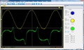 A terhelt képen látható, hogy a feszültséggel fázisban lévő áram megnövekszik, 8W körüli értékre. A nullaátmeneti tüske az továbbra is marad.