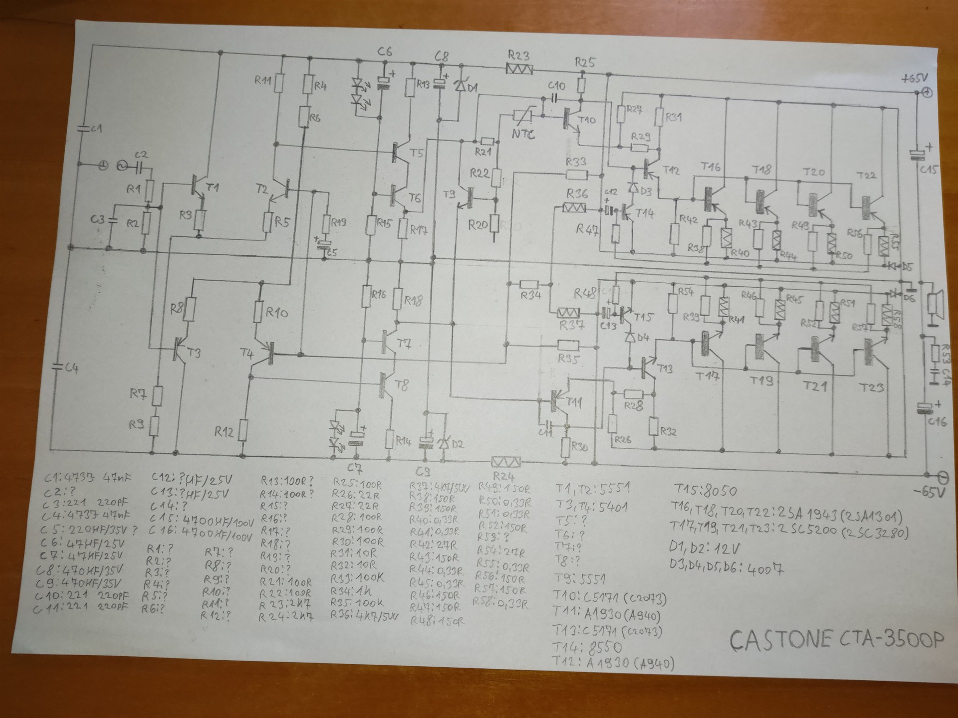Úgy vélem a kis TO92-es tokozású tranzisztorokból jók azok a típusok amik a nyákon fel vannak tüntetve pl. az 5551-es 160V-os így alkalmas lehet a kapcsolásba, illetve mivel az 5551-es párja az 5401-es így arra jutottam, hogy a T3 és a T4 ezek a tranzisztorok lesznek. A T5, T6, T7, T8 tranzisztorok típusa és polaritása még mindig kérdéses valamint minden kérdöjellel ellátott alkatrész ezeken felül még az R20 bekötésére és a teljes kapcsolás helyességére szeretnék választ kapni.
