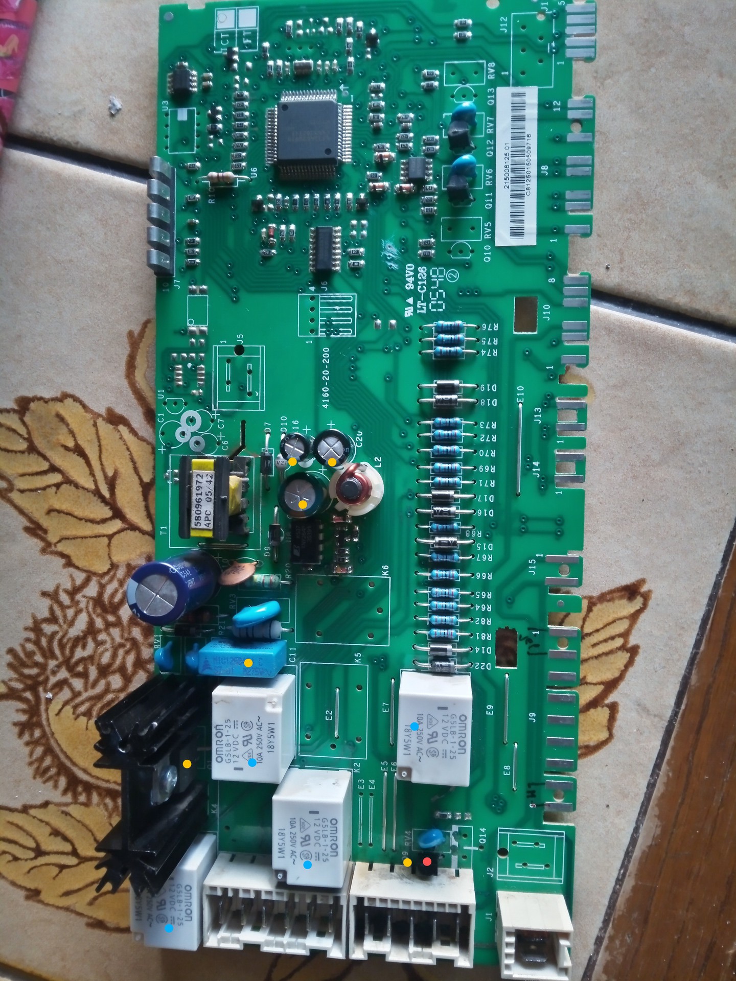 Szép estét! Indesit mosógép a paciens. F01 hiba . Mellékeltem képet. A sárga pöttyös alkatrészek cserélve, a kék pöty kiszedve kipróbálva, a piros ( triak) lábai elégve, ( ajtózár). Motor csere is volt. Nem indul csak szivattyúzik pár másodperc után. A táp csak 6.3v , de a szivattyú rellét kapcsolja. Hogyan tovább?