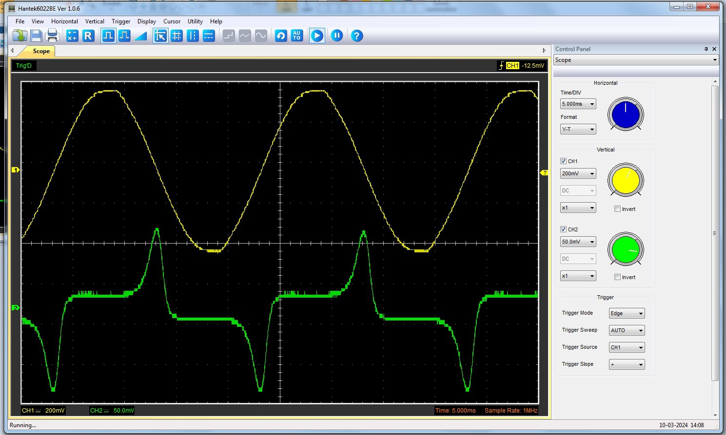 A felsőn az egy menet feszültsége 200mV/ osztással látható, az alsón egy áramváltón keresztül a primer áram. Az áramváltó miatt ez 30mA/ osztás.
