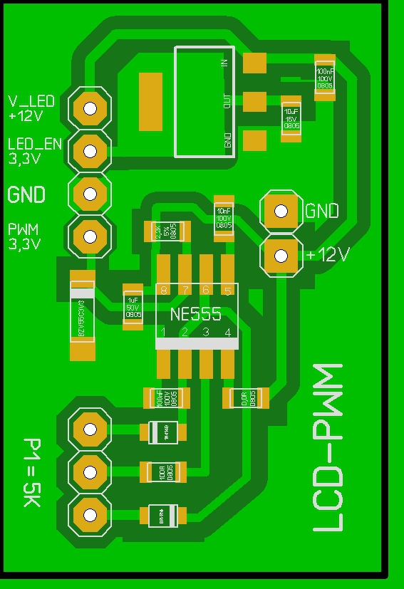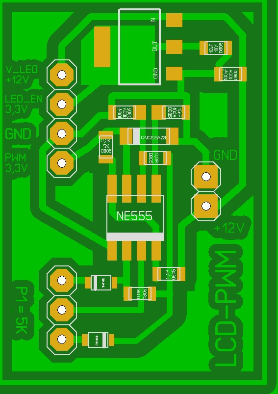 Elég régen volt már hogy Proli007-től kaptam egy kapcsolási rajzot (első kép), amivel egy törött LCD kijelző led driverének a PWM bemenetét lehet állítani, fényerő szabályzás végett. Egy ideje használtam már a kapcsolást, leginkább alacsony fényerő fokozaton, és azt tapasztaltam hogy egy idő után bekrepált a szerkezet, de sajnos nem tudom miért. A hiba úgy kezdődött hogy az LCD panel egy hosszabb, 5-15 perces járatás közben magától lekapcsolt, majd a potmétert feltekerve a maximum fényerőre újra üzemkész állapotba került, utána pár napig nem történt semmi, majd megint megtörtént és az idő teltével egyre sűrűsödtek a kikapcsolások, míg már nem lehetett bekapcsolni a kijelzőt. Egyébként a kijelző fényerejét amikor levettem alacsony fokozatra mindig visított a led driver, nem tudom ennek van-e jelentősége. A hiba nem a led driverben van, a LED_EN 3,3 Voltját előállító feszültség stabilizátor IC is működik, szerintem az smd kivitelű NE555 IC szállt el. Igazából egy olyan kapcsolási rajzra lenne szűkségem ami mentes az effajta meghibásodástól. Köszönöm, és szép estét mindenkinek.