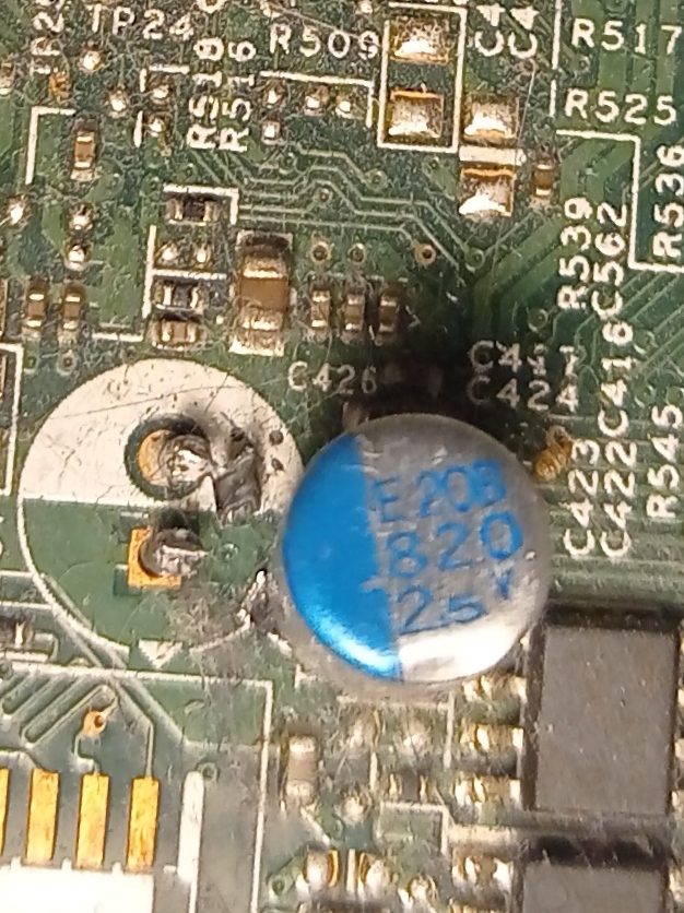 A kondenzátorház ferdén ül az áramköri lapon, ami az alsó gumidugó kinyomódása miatt keletkezett, esetenként a kondenzátor aljáról az alaplapra szivárgott elektrolit, ami sötétbarna vagy fekete felületi lerakódásként látható a NYÁK-on.[24] A kiszivárgott elektrolit összetéveszthető a vastag rugalmas ragasztóval, amelyet néha a kondenzátorok ütés elleni biztosítására használnak. A kondenzátor oldalán lévő sötétbarna vagy fekete kéreg mindig ragasztó, nem elektrolit. Maga a ragasztó ártalmatlan. "