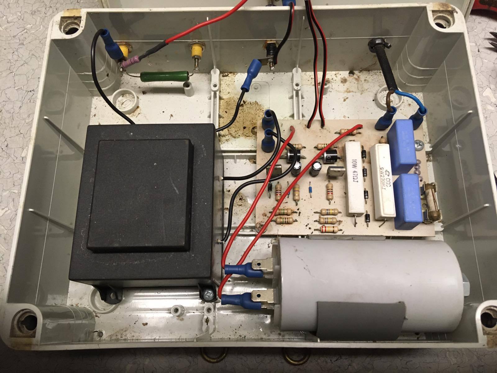 Megtörtént a trafó csere. Két egyforma 12V os van szemben. Csak amit vártam, az be is jött. Az elsőként felvázolt összeállításban a 16 µF os kondit felnyomta 380-400Vra, most viszont, 300-320V ra. Sokkal erőteljesebb volt a szikra is. Ebből a trafóból, nem 12V jön, hanem 14-16V. Működés közben is.