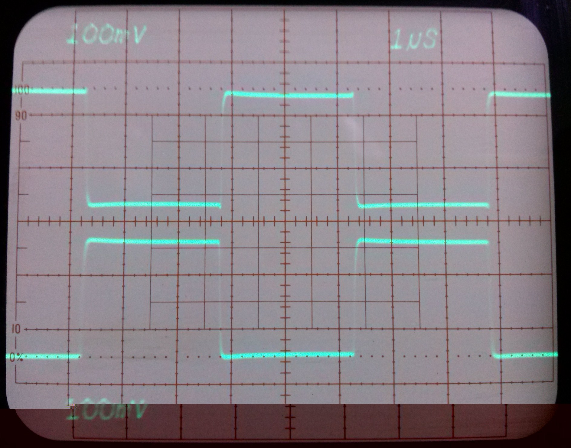 1 kHz-es négyszögnél meg fog jelenni egy rövid idejű tüske a bemeneten. A "tüske" szélessége a késleltetés. Szerencsére olyan okosak ezek a digitális szkópok, hogy mutatják a tüske szélességét, azaz a némító áramkör késleltetését. Ez pontosan 1 us... ennél gyorsabb nem is kell.