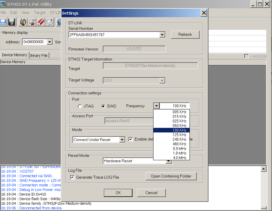 BluePill-t szeretnék programozni, de az ST-Link és a BluePill között viszonylag hosszú vezetéket szeretnék használni. ST-Link util esetében, (a hosszú vezeték miatt) csak akkor ismeri fel a processzort, ha a default 4,0MHz-es SWD frekvenciát kisebbre csökkentem.