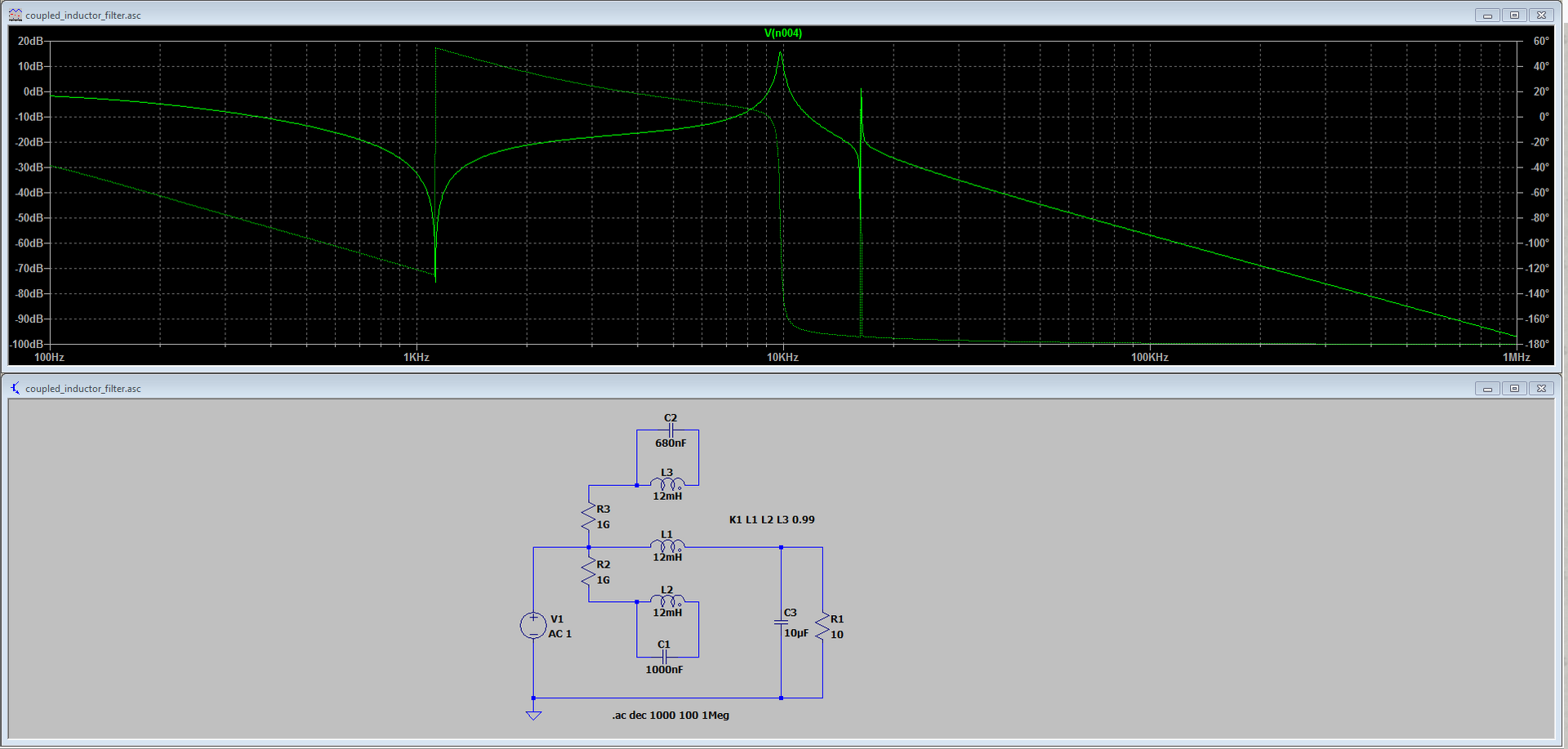 Nem jöttem rá mire jó ez így. A kiszámolt rezonanciafrekvenciák közelében 1 frekvencián lyukszűrőként viselkedik, de 10 kHz-nél van egy kiemelés majd felette még egy rezonancia frekvencia. Ez utóbbiak frekvenciája erősen függ a csatolási tényezőtől.