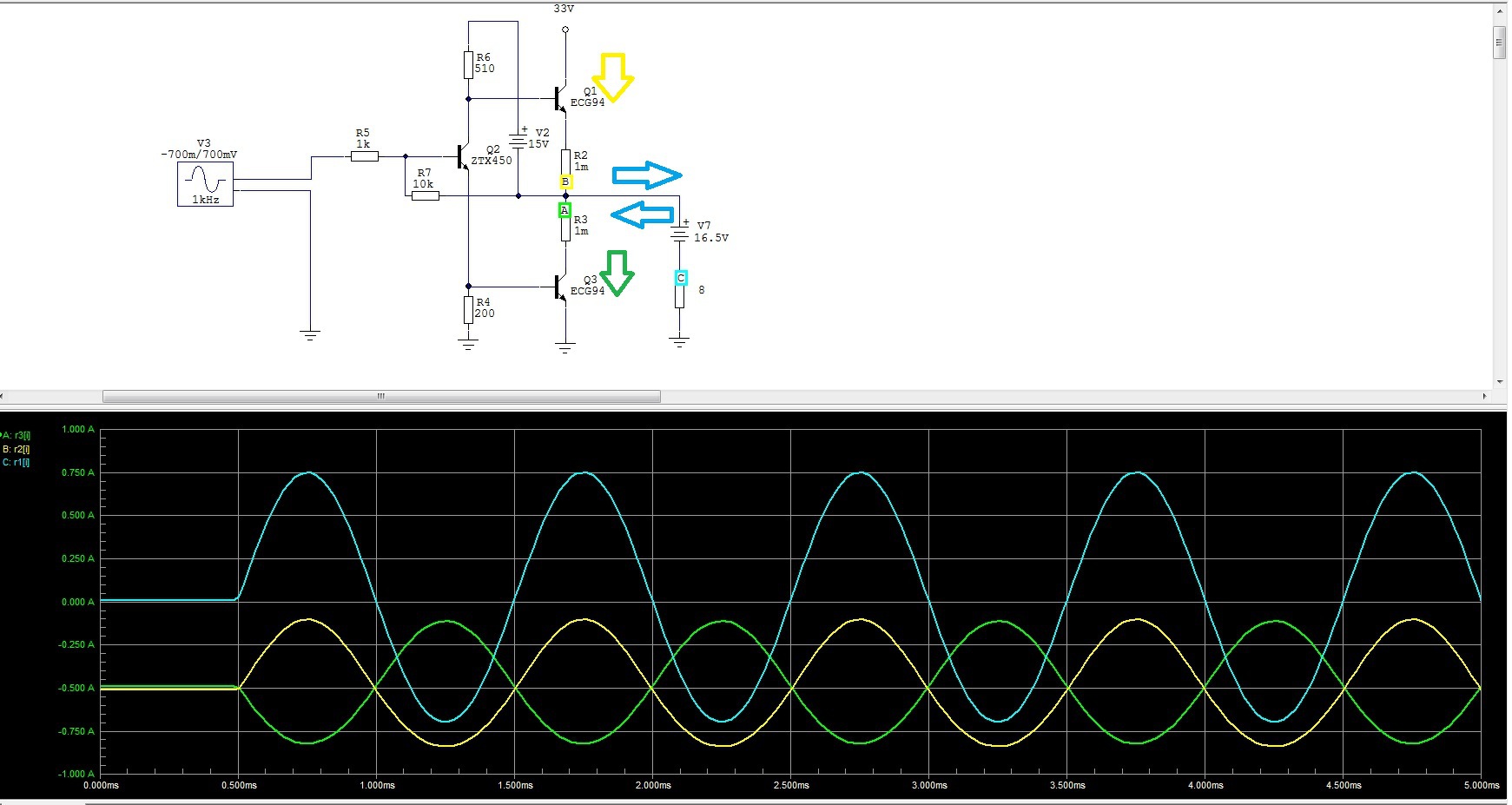 Ez egy nagyon lebutított séma, és csak az áramokat szerettem volna feltüntetni. Fél amperes nyugalmi áramot állítottam be. A kimeneti áram az az alsó és a felső oldali tranzisztor áramának a különbsége. Kivezérlés nélkül ez ezek az áramok egyenlőek, ezért a kimenet felé nem folyik áram.