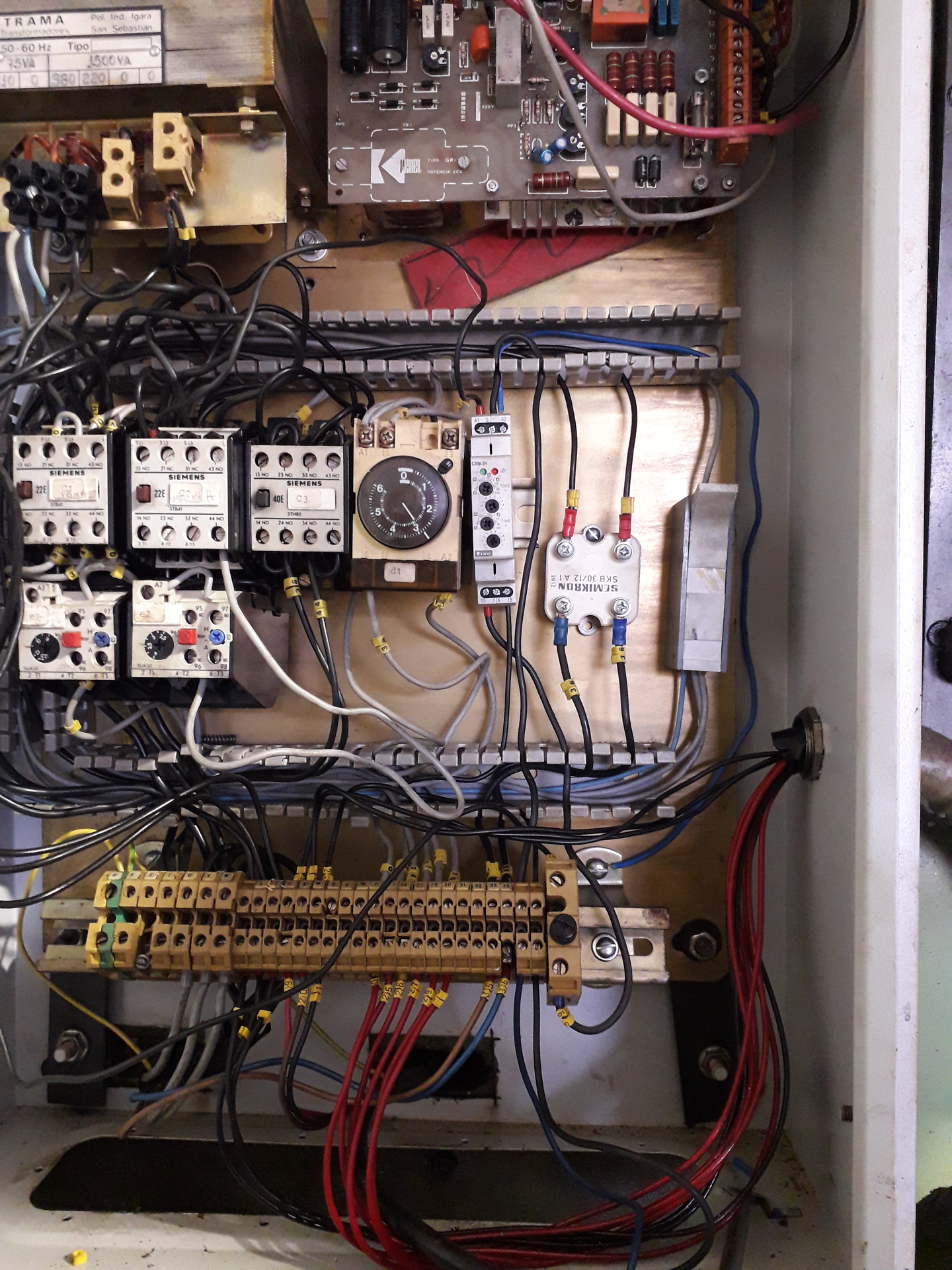 Igy neki is láttam kibontásnak,lassan haladok,de eredményesen. A középső soron látszik egy időrelé,ami az automata kenésért felel. Felső sorkapocs a betáp és ide a nagy trafóról érkezik szál,a relé adatlap szerint 230 Vos. A képen látszik egy kék kábel,ami a relé behúzótekercséről jobbra tart,majd lemegy az alsó kalapsín csavarja alá. Ez lehet az összekötés,ezt eltávolítva már nem megy le a Fi relé. Persze,az emulziószivattyút és az utólagos lámpa tápegységét is kikötöttem. Megpróbálok óvatosan méregetni,a mágneskapcsolóknál még sok a kérdőjel.