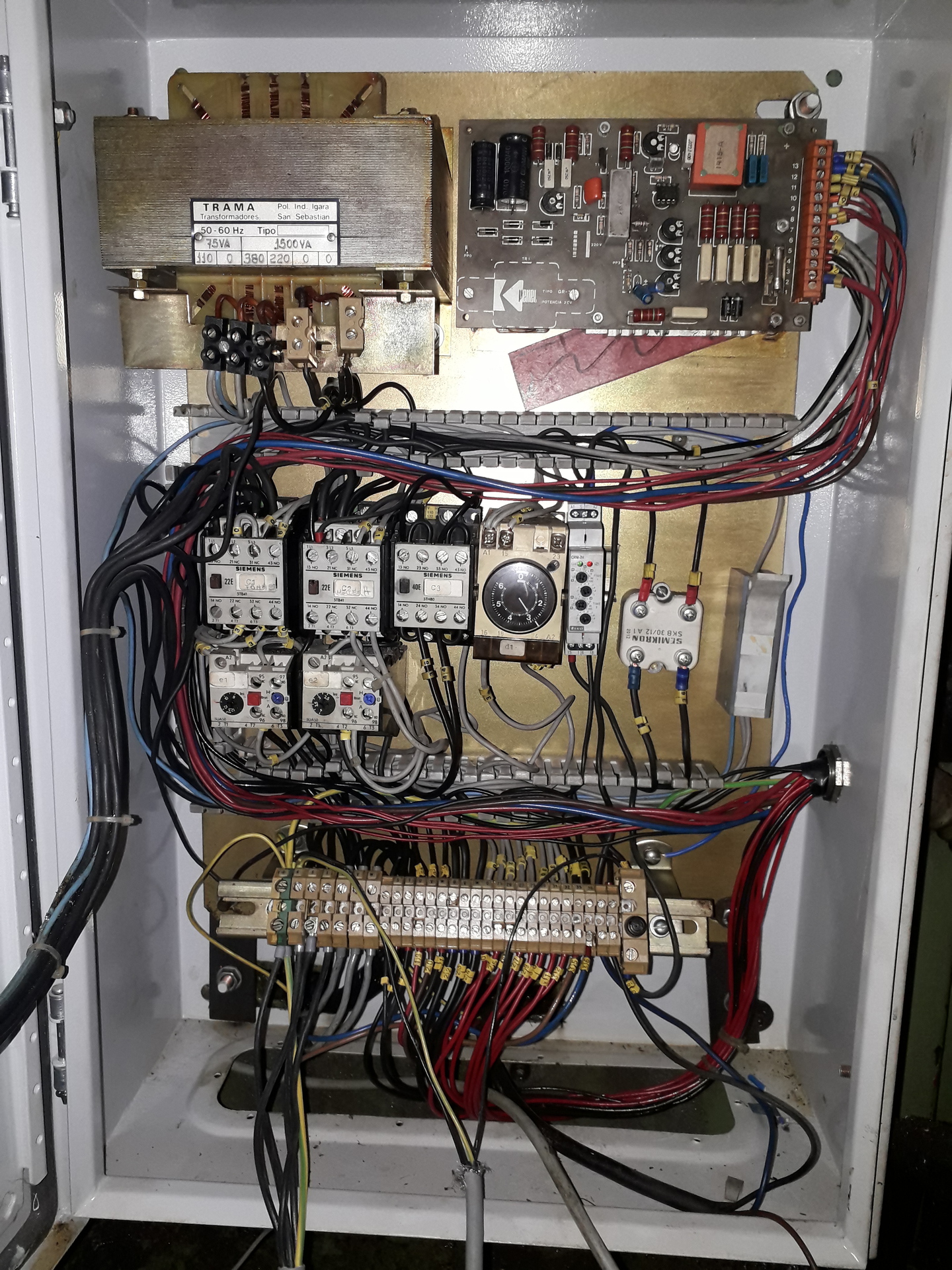 Hoztam az igért képeket,kicsit más így a helyzet. Eddig úgy tudtam,hogy a bal felső nagy trafó a régi előtoló motort hajtotta. Rákeresve a relékre,110Vos tekerccsel rendelkeznek,így valószínűleg azokat is az táplálja. Nem teljesen értem a leágazásokat sem,melyik a primer-melyik a szekunder oldal. A vezérlőszekrény egy része jelenleg felesleges,mivel a komplett régi előtolómű hiányzik. Az utolsó 3 képen az automata olajozás motorja látszik,két kondi is be van hozzá kötve.