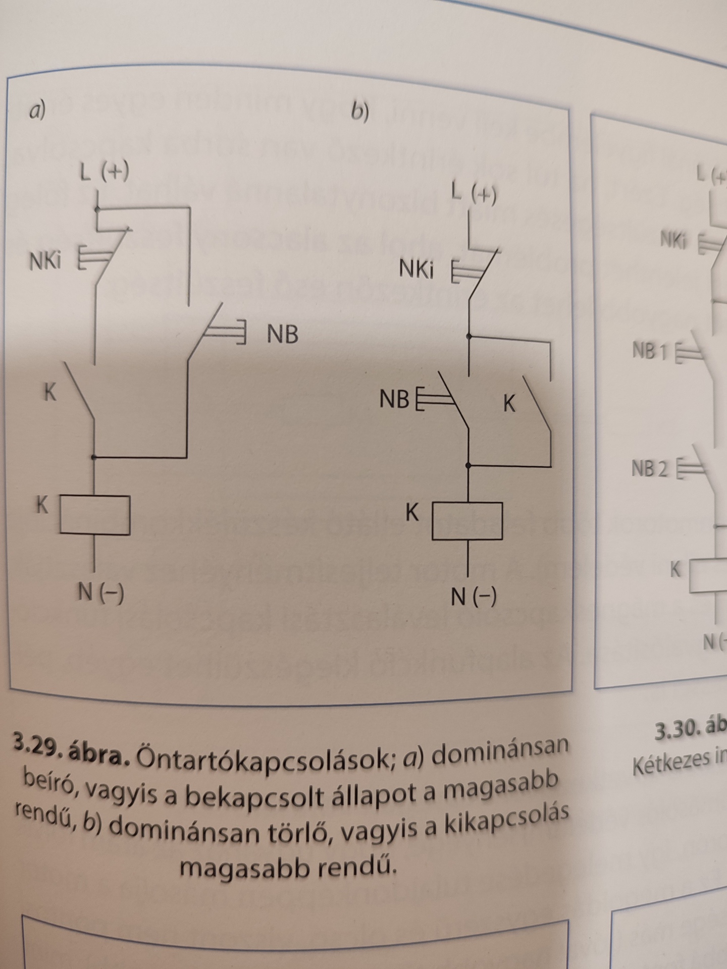 b: Ha az NKi nyitva van, akkor lényegtelen az NB és/vagy a K állapota, a relé kikapcsolva van. "a" esetben az NB a mester, "b" esetben az NKi. Kb. ez van leírva szövegesen is. Gyakorlatban az utóbbi (b eset) az általánosan használt.