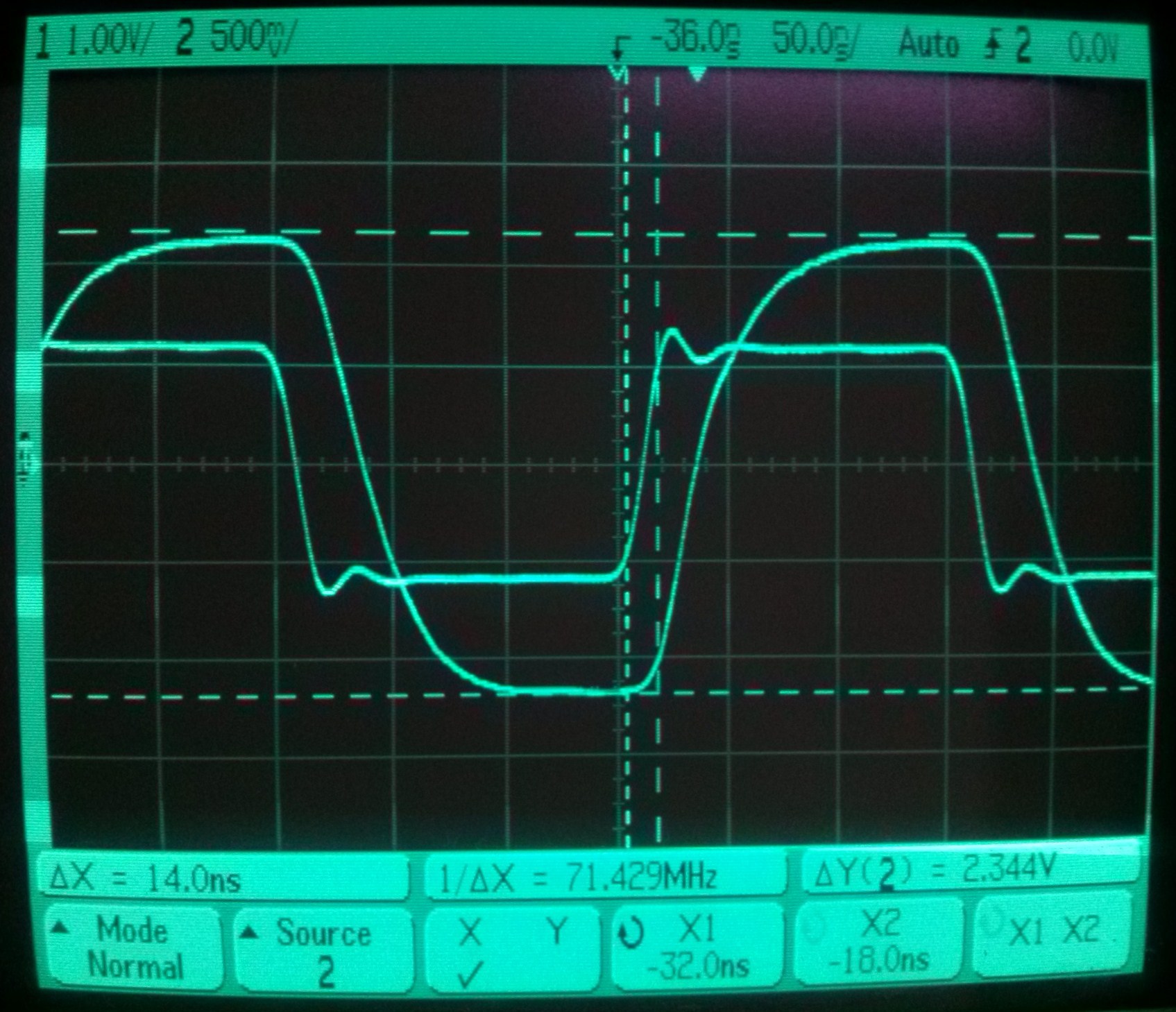 A -3dB-es pont 8 MHz körül van, de ennek nincs akkora jelentősége, lényeg az, hogy elég gyors és túllövésmentes a kimeneti jel. A csillapítatlan négyszög a bemeneten továbbra is a vezeték illesztetlenségéből adódik... nem tartottam fontosnak lezárni a bemenetet 50 Ohm-mal, illetve az invertáló erősítőt nem is lehetne lezárni, mert bír ekkora áramot (és ugye a szimmetrikus meghajtásra szükség van most, ez fontosabb mint az illesztettség).