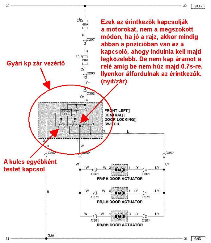 A rajzod a szokásos agyrém rajz, de nagyon úgy néz ki, hogy csak 3 ajtóban van motorod (ahogy ezt már írtam) és a vezető felőliben csak a mikrokapcsoló van. Tehát tudnád vezérelni, de a bal első ajtó motor híján úgy marad...