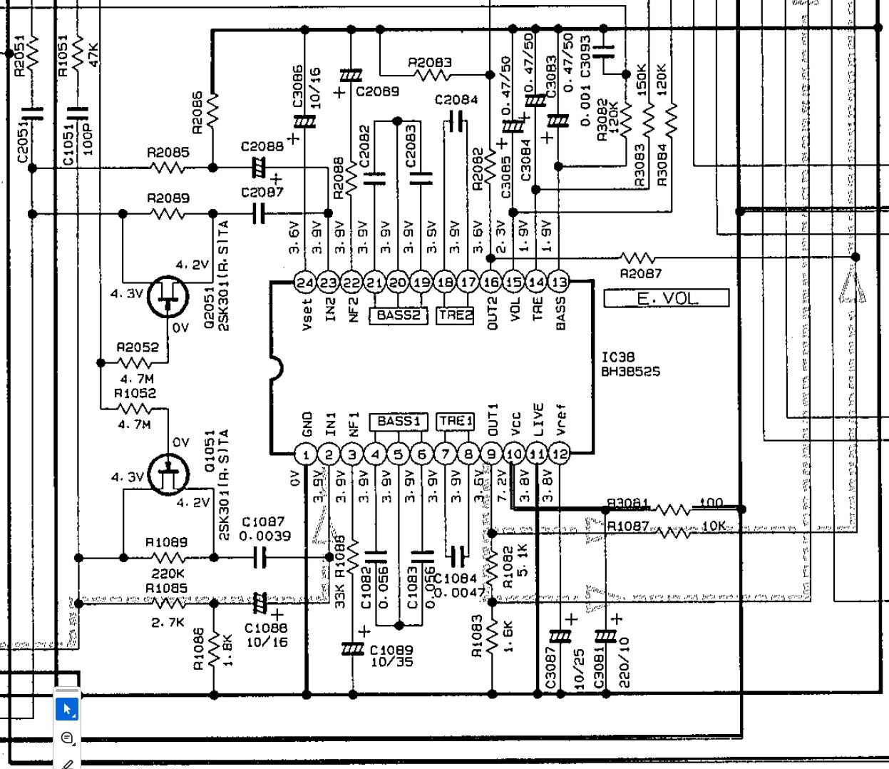 Van 2 JVC UX 1500R GR típusú microhifim, ami rendelkezik külön kimenettel "Subwooferhez". A gondom, hogy nagyon gyenge a jel, ami ott kijön. Ha rákötök egy aktív mélyládát szól de nagyon halkan hiába tekerem max-ra a hangerőt. Már több mélyládával próbálkoztam, de mindegyikkel ugyan az van és mindkét hifinél ugyan ez a jelenség. Csatoltam két képet a műszaki doksijából, amelyeken látszik, hogy néz ki ennek a kimenetnek a kapcsolása. Rá tudnátok esetleg nézni, hogy ez így jónak tűnik? IC38 9 illetve 16-os lábától indul ezeket közösíti az R1087 és R2087 (10-10k) ellenállásokkal majd a jel átmegy egy 10µF (C3088) kondin és egy 10k-s (R3086) ellenálláson.