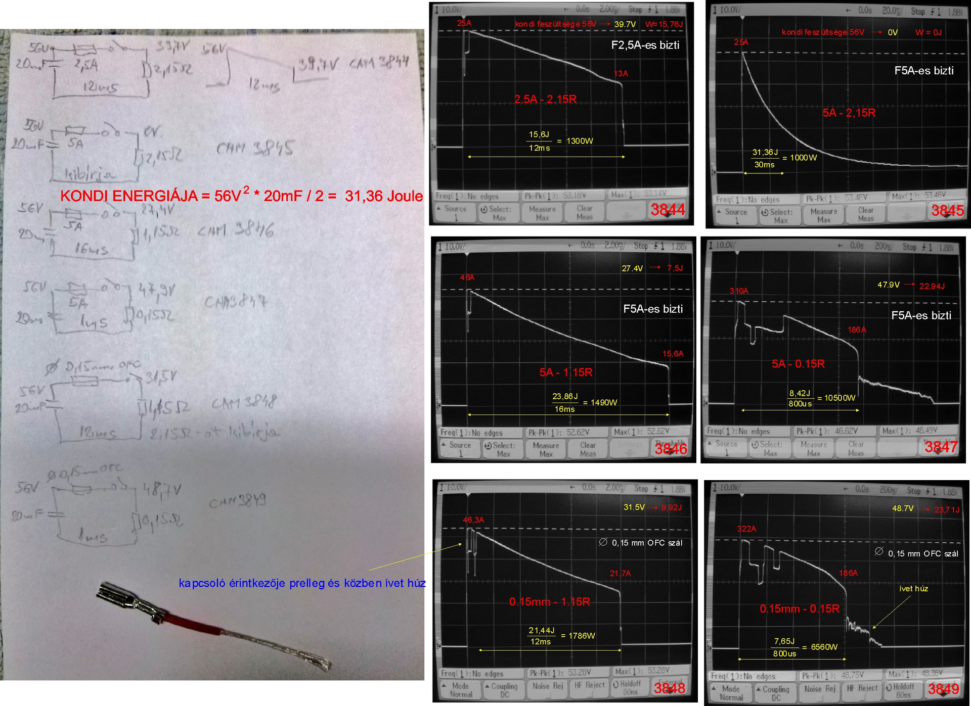 Ezt az energiát én úgy értettem ahogy mértem is. Feltöltök egy kondit x feszültségre. Ez tárol U2C/2 energiát. Minél nagyobb ellenállást kötök sorba a biztosítékkal annál több energiát vesz ki a (puffer)kondiból. Ha a biztosítékkal közvetlenül zárom rövidre a kondi fegyverzeteit, csak 1,25V-ot esik a 20mF-os kondi feszültsége.