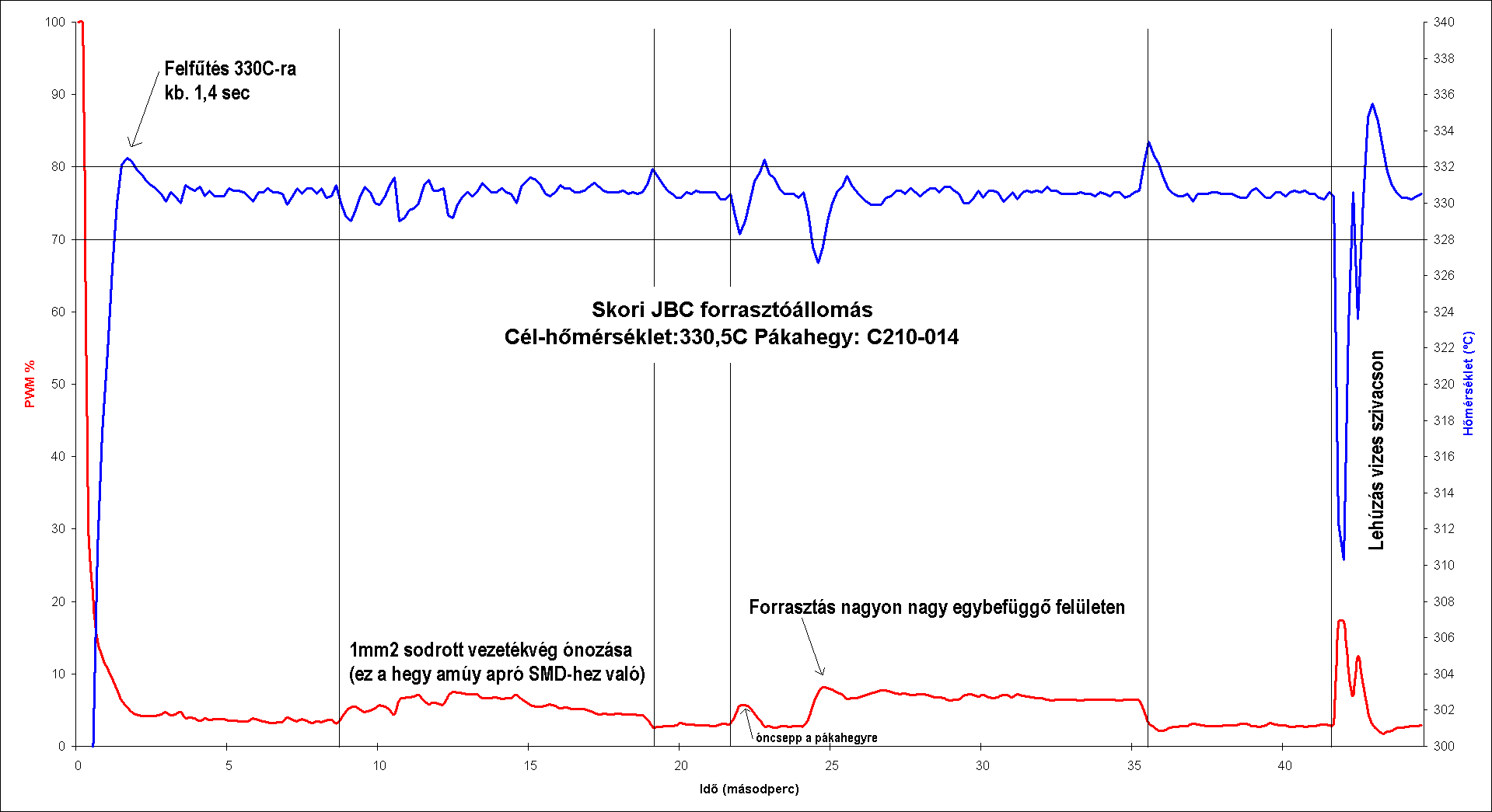 Végeztem egy újabb mérést a forrasztóállomásomon, mivel C210-es heggyel még nem volt lementett mérési eredményem. Azt kell tudni, hogy ez a C210-014 egy kicsi, vékony, hajlított végű, hegyes pákahegy, ami elsősorban apró SMD alkatrészek forrasztásához lenne alkalmas.