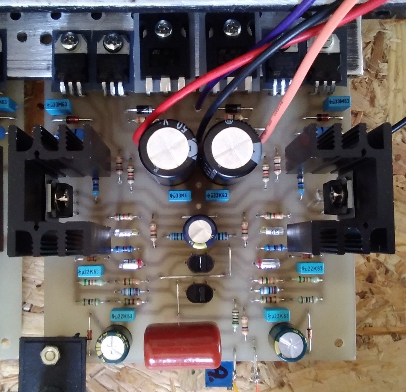 A próbadarcil, alaposan szétfurkált (próba)hűtőbordán, kis (próba)trafókkal (a nagyobb trafók nem fértek volna az osb lapra) olcsó alkatrészekből, az eredetitől alaposan eltérő dizájnnal, bár ha van a tranyóknak furatgalván meg felül is pad, akkor fel lehet őket szerelni az eredeti szerint is. Valamint át van méretezve +/-35V-os tápra.