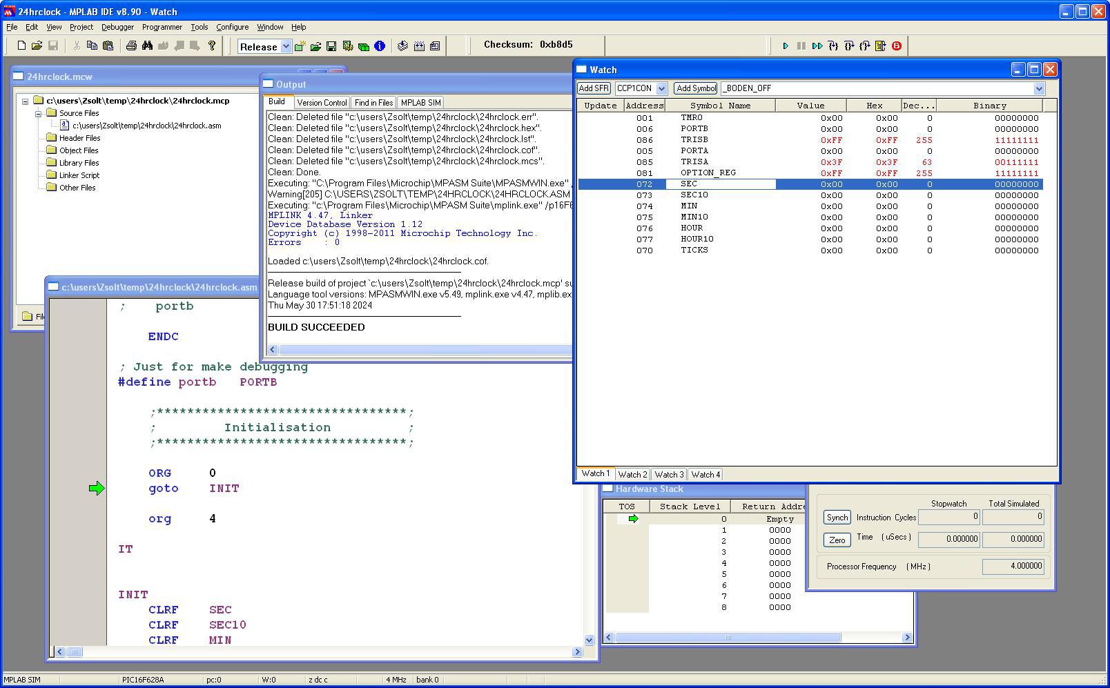 Helyezd el a forrást egy mappában. Készíts egy projectet: Project / Project Wizadr - PIC16F628 vagy 16F628A kiválasztása - assembler toolchain kiválasztása - a fenti mappában egy projectnév megadása (24hrclock), megnyitása - a 24hrclock.asm hozzáadása a projecthez. Mód beállítása: - a képernyő közepén a Debug mezó átállítása Release -re Fordítás indítása: Absolute kód választása. A telepítéskor az include mappát beállította a program, de a Project / settings alatt az Include mappa módosítható. Mit üzen, amikor nem fordul le? Milyen frekvenciájú quartz -ot használsz? A hozzászólás módosítva: Máj 30, 2024