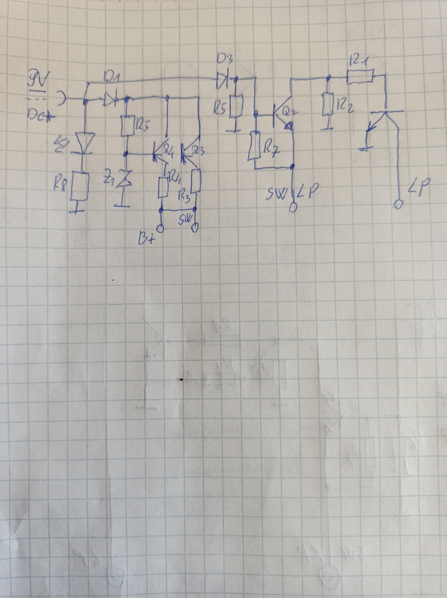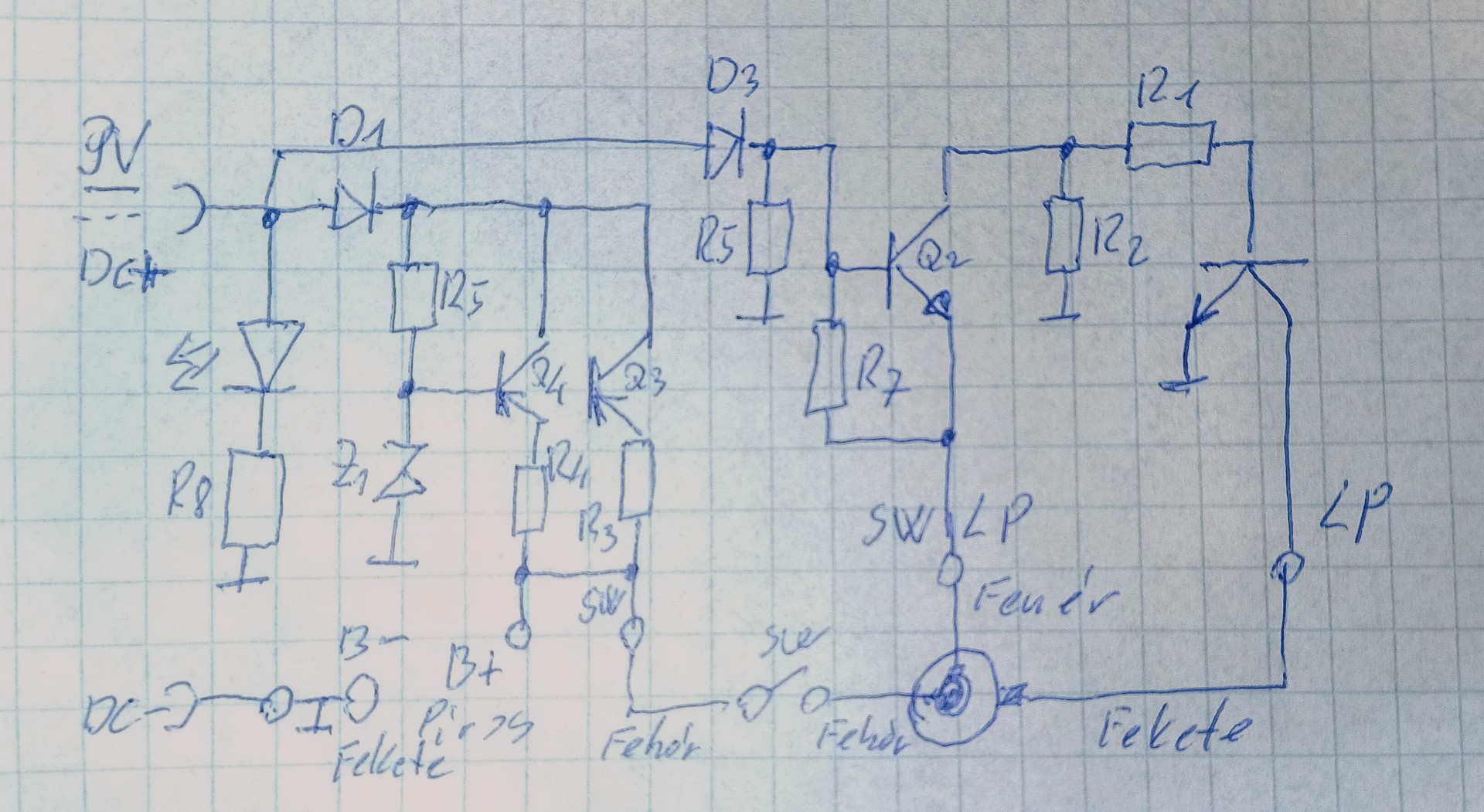 Üdv a csapatnak! Egy fényvetővel gyűlt meg a bajom(képek lent). Az akkut kicseréltem, az izzó krp 2,4v 0,5A(rendelés alatt). Így izzó nélkül a 9V-os adapteren 8,1v-tal tölt, ezt én sokallom! Elvileg 7,2V a max egy olomsavas aksinál. Megpróbáltam vissza rajzolni(remélem nem tévesztettem(kép lent). A Q3 és Q4 tranzisztorok bázisai össze vannak kötve, lemaradt. A Z1 zener értékét nem tudom leolvasni, mi lehet az értéke?