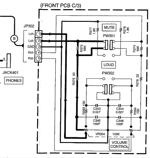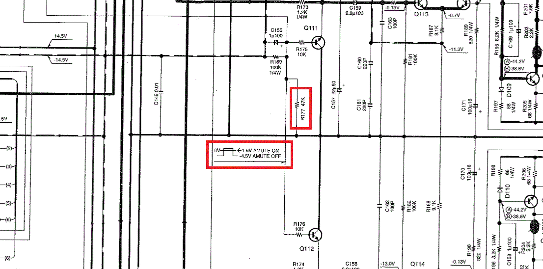 Keresd meg a végerősítő bemeneténél az R177 ellenállást és mérj rajta feszültséget, mikor elmászik a hangerő. A mellékelt ábrán az ajánlott értékeket bekereteztem.