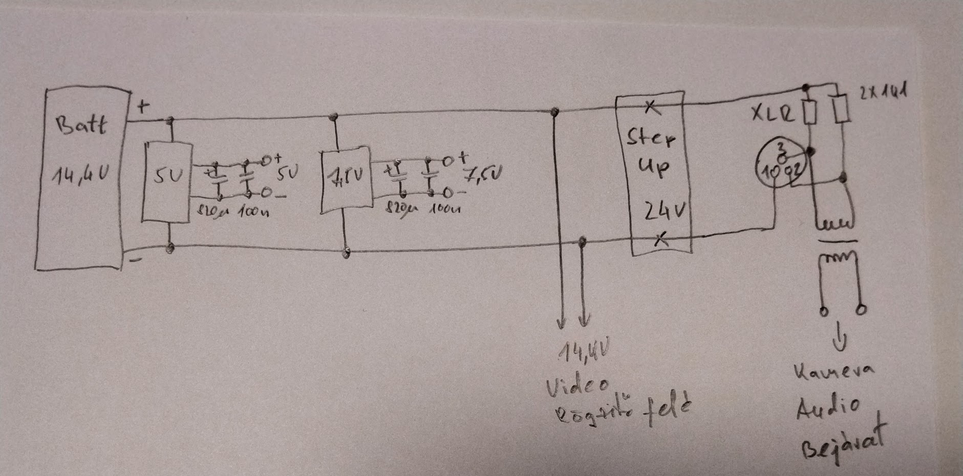 DC zavarszűrésben kérnék segítséget; adott egy 14,4V-os kamera akkumulátor, amire párhuzamosan csatlakozik - 5V step down konverter, USB számára állít elő áramot - 7,5V step down konverter, egy Sony A7IV kamerát lát el - Atomos Ninja V video rögzítő - hűtő ventilátor (pwm szabályzóval) - mikrofon fantom táp Utóbbival gyűlt meg a bajom, de nagyon, sok ilyen fantom tápot építettem (nálam 1,1K és 14,4V megy rá, a legtöbb mikrofon már ezzel is működik, az enyém is), itt is ezt tenné, ha rajta kívül nem lenne más is párhuzamosan kapcsolva az aksira. Sajnos mindent lehet hallani a mikrofon kimeneten, még azt is, ha zársebességet állítok a gépen, el se hittem, de pl ennek hatására változik az épp aktuális zavaró freki, ami ráül a hang kimentre, de hallani a ventilátort és minden egyebet. Próbálkoztam azzal, hogy teszek egy step up konvertert az előfok tápútjába (úgy is papíron magasabb fesz kellene neki), javult a helyzet, de jó nem lett. Valakinek van valami ötlete, hogy mit próbáljak meg?