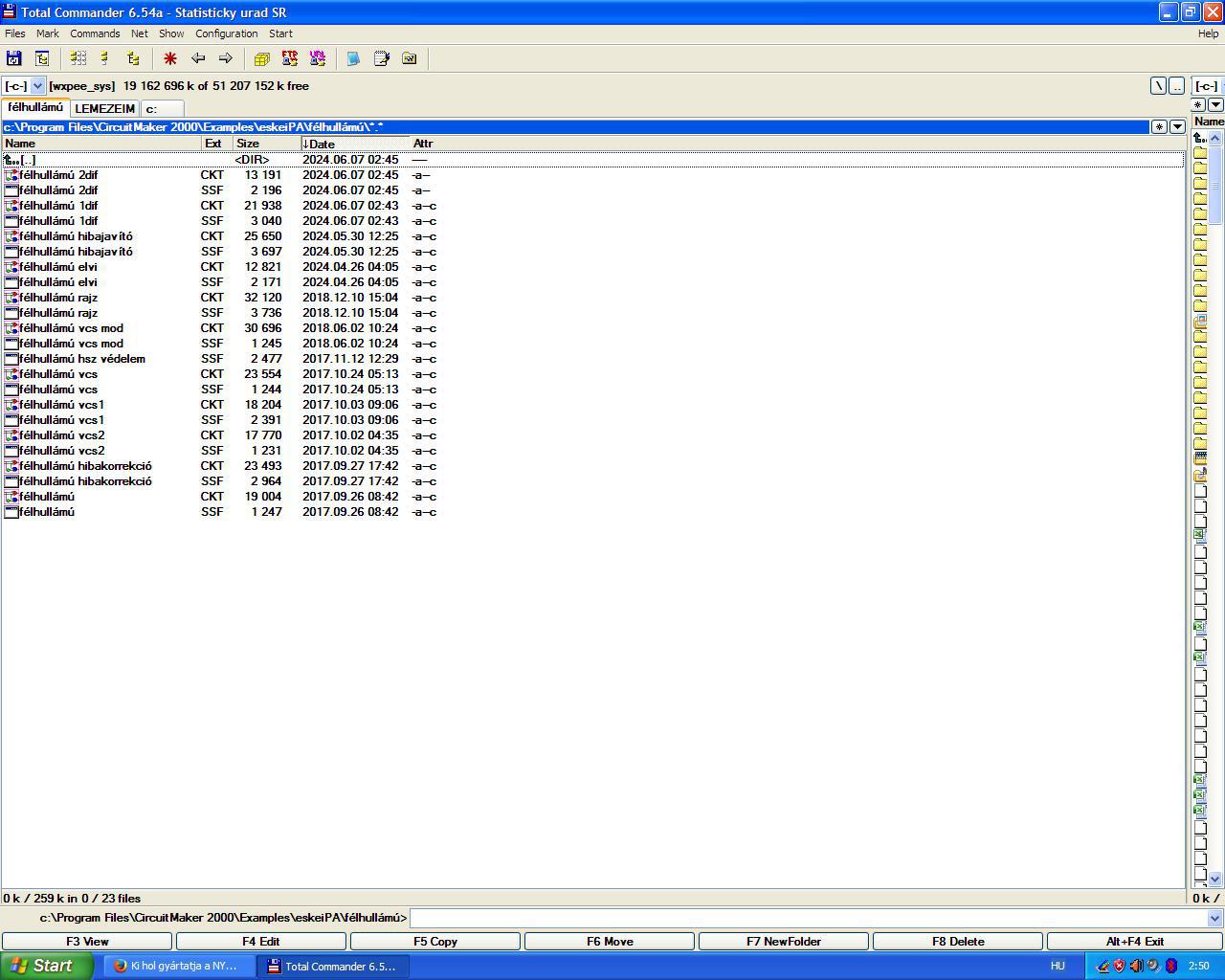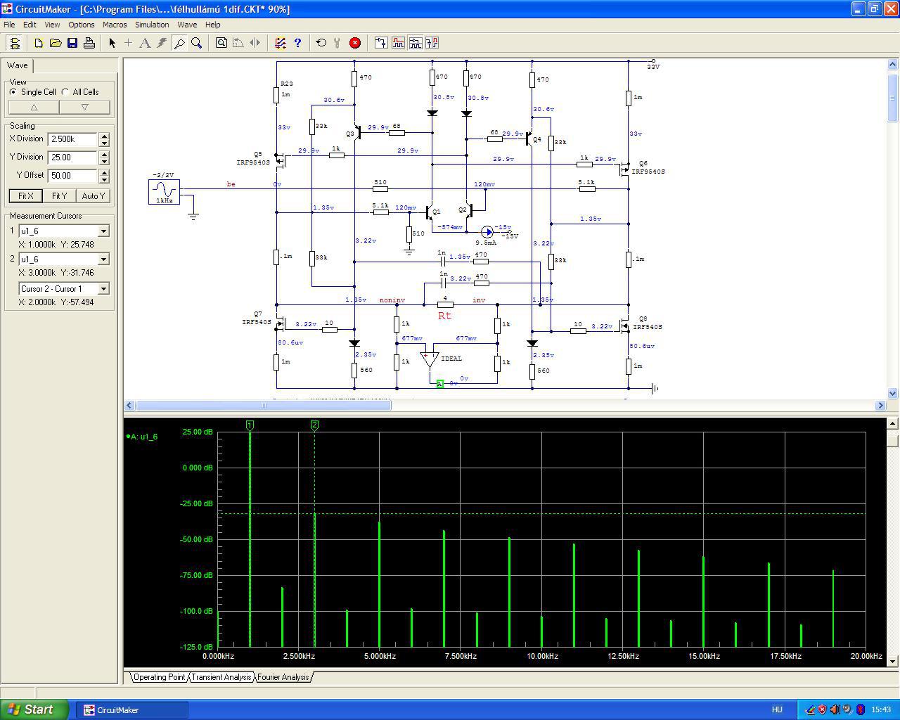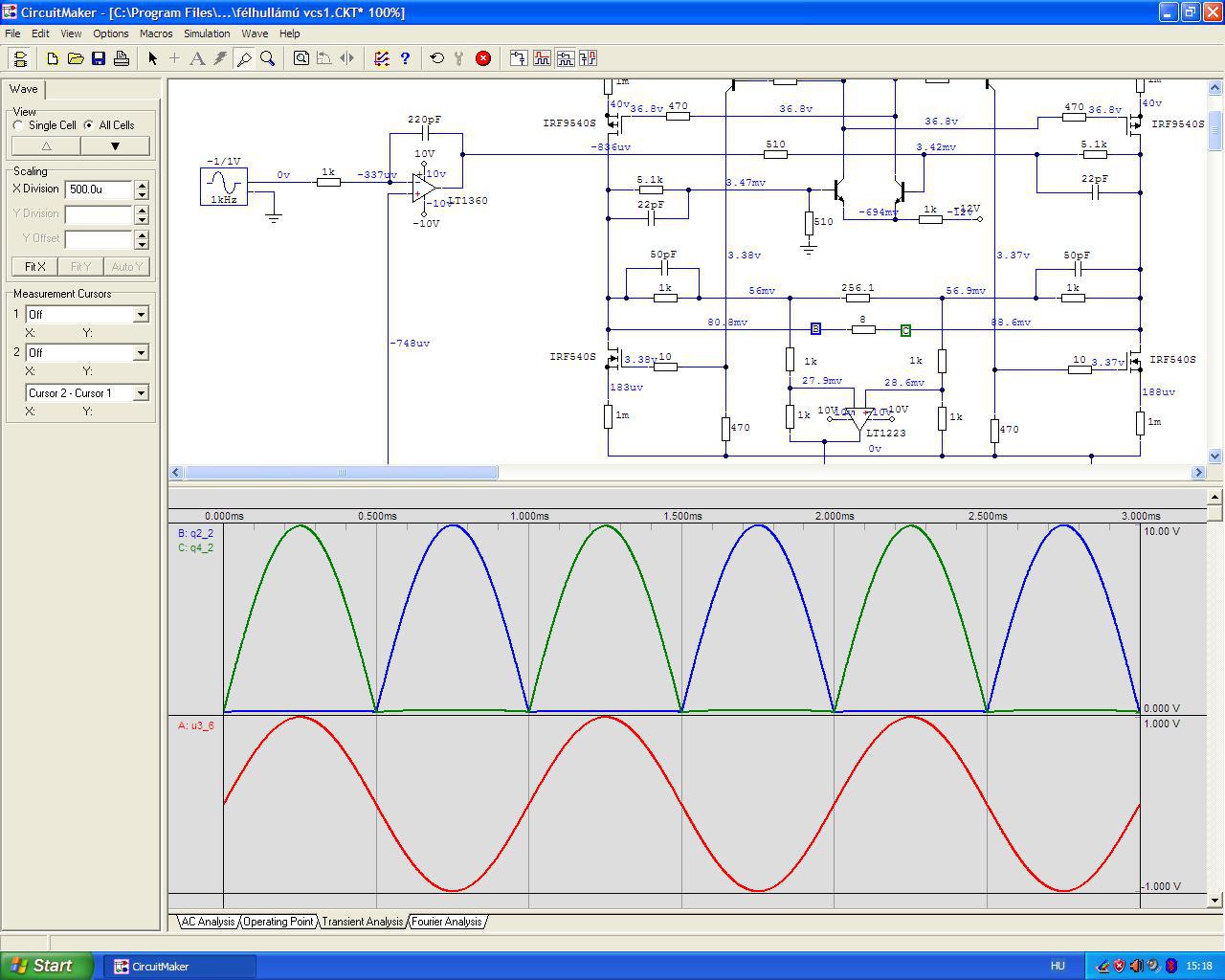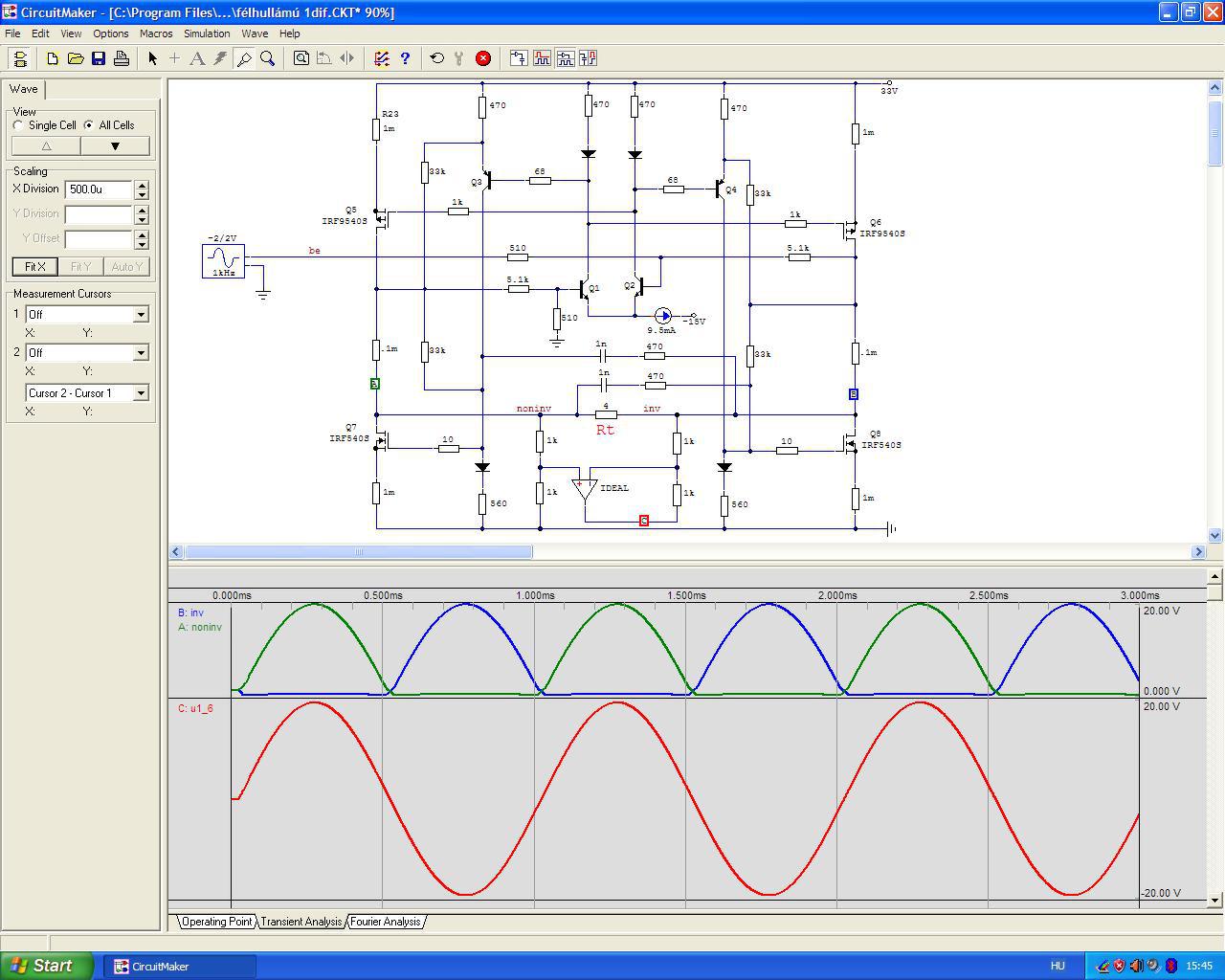 Azért neveztem el félhullámúnak, mert a félhidak kimenetén valóban csak a két (torz) félhullám jelenik meg és magán a terhelő ellenálláson átfolyó áram "rakja össze" a (többé-kevésbé) torzítatlan kimeneti feszültséget. Érdekességképpen megmutatom a kapcsolás szimulációnak keltezését. Tulajdonképpen elég gyorsan "összecsaptam", aztán valami miatt félretettem az egészet és elfelejtődött. De a deszkamodellt kölcsönadtam Bandi barátomnak, akinek a mai napig ez a kedvenc végfoka. Neki ígértem meg, hogy újra elő fogom venni ezt a rajzot és megpróbálom tovább fejleszteni. Időm van, kedvem egyelőre nincs hozzá. Idézet: Az érdekelne engem nagyon, hogy tudná itt valaki (akár hármótok közül) "hagyományos módszerekkel" közérthetően - mérnöki precizitással - elmagyarázni ennek az áramkörnek a működését úgy, hogy mindenki megértse. Amikor a Diesel-mozdony szerelő agyammal kitaláltam ezt a kapcsolástt, a képzeletemben pillanatértékek szerepetek, csak így sikerült "működésre bírnom". Ma már nem tudnék ilyesmit kitalálni és nem is nagyon érdekel az egész. „Nekem az segített sokat az ilyen jellegű áramkörök működésének a megértésében, hogy nem statikusan, pillanatnyi értékeket néztem, hanem egy függvény diagramként rajzoltam be az áram változásokat.”