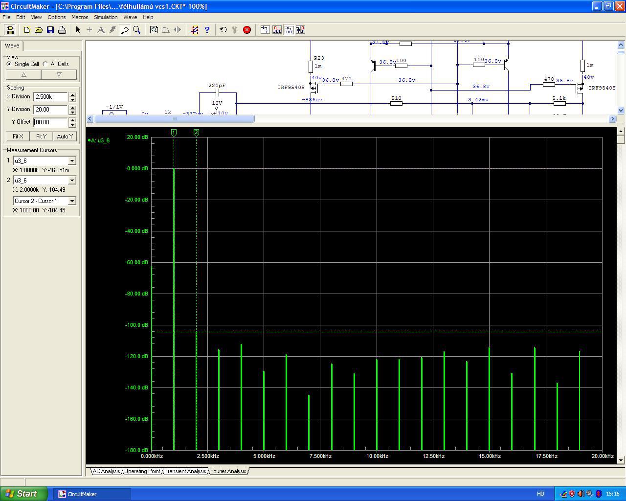 Egyébként, te már megfogalmaztad a működést. Ha valaki többet tud annál, hogy egy tranyónak három lába van, az meg fogja érteni. ( Ha akarja. ) Amit nem értek, hogy mit csinálnak a 33k-s ellenállások? A spctrum képet is azért kérdeztem, mert ez végül is egy hídkapcsolás. Elvileg a páros felharmónikusok kiesnek. Ez rendben van, amiket feltettem elrendezéseket azon ezt szépen lehet látni. Sajnos, csak akkor, ha szimmetrikus vezérlést kap, asszimmetrikus vezérlésnél ez nincs meg így a THD is legalább a kétszerese. Emiatt lettem volna kíváncsi egy spectrum képre, mert nálad is csak aszimmetrikus vezérlést kap a végfok. Ami még problémás, hogy az rendben van, hogy a páros felharmónikusok erősen csökkennek, de a páratlanok miért nem? ( nekem elég, ha konyhanyelven magyarázod, biztosan meg fogom érteni.)