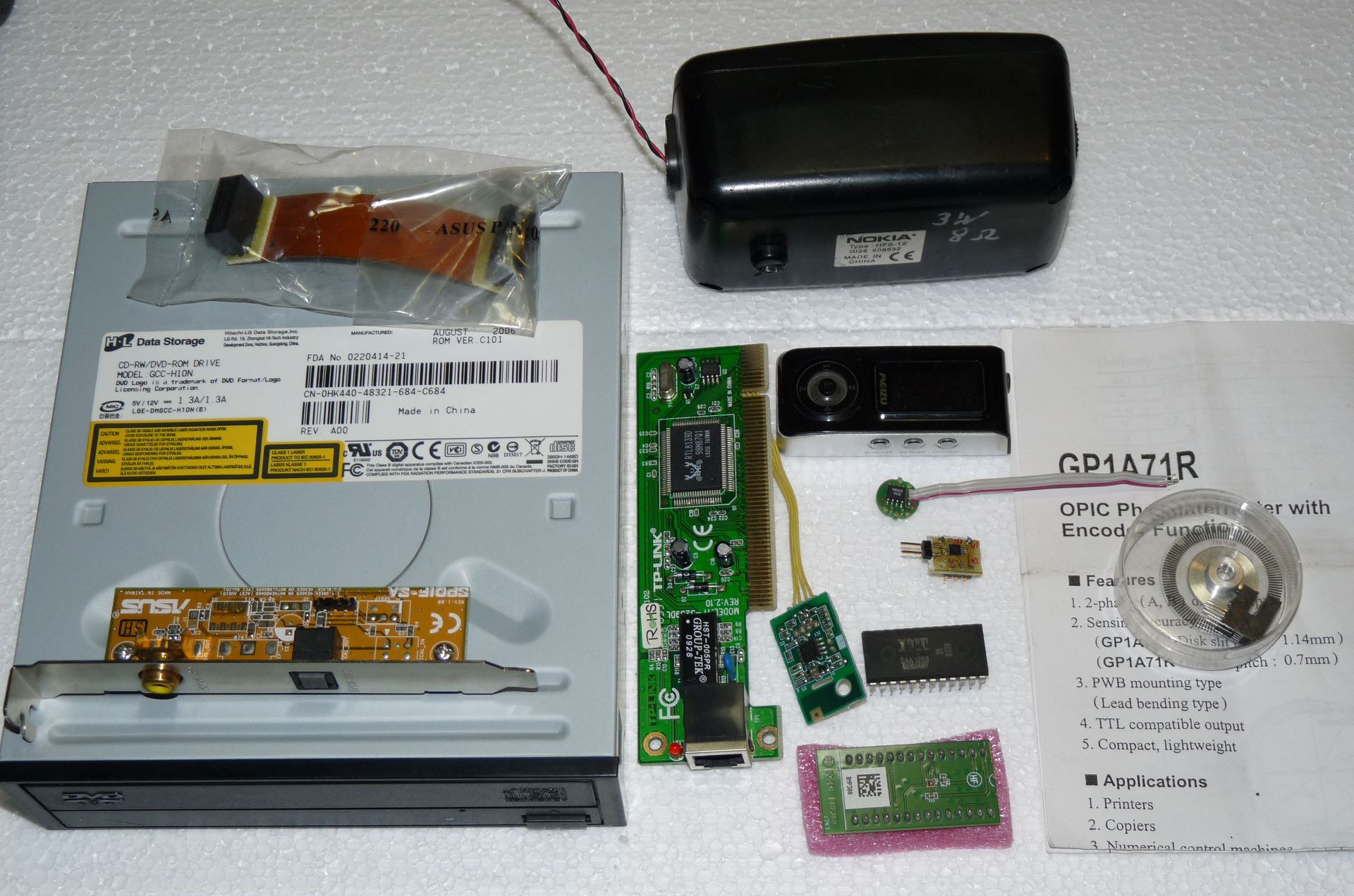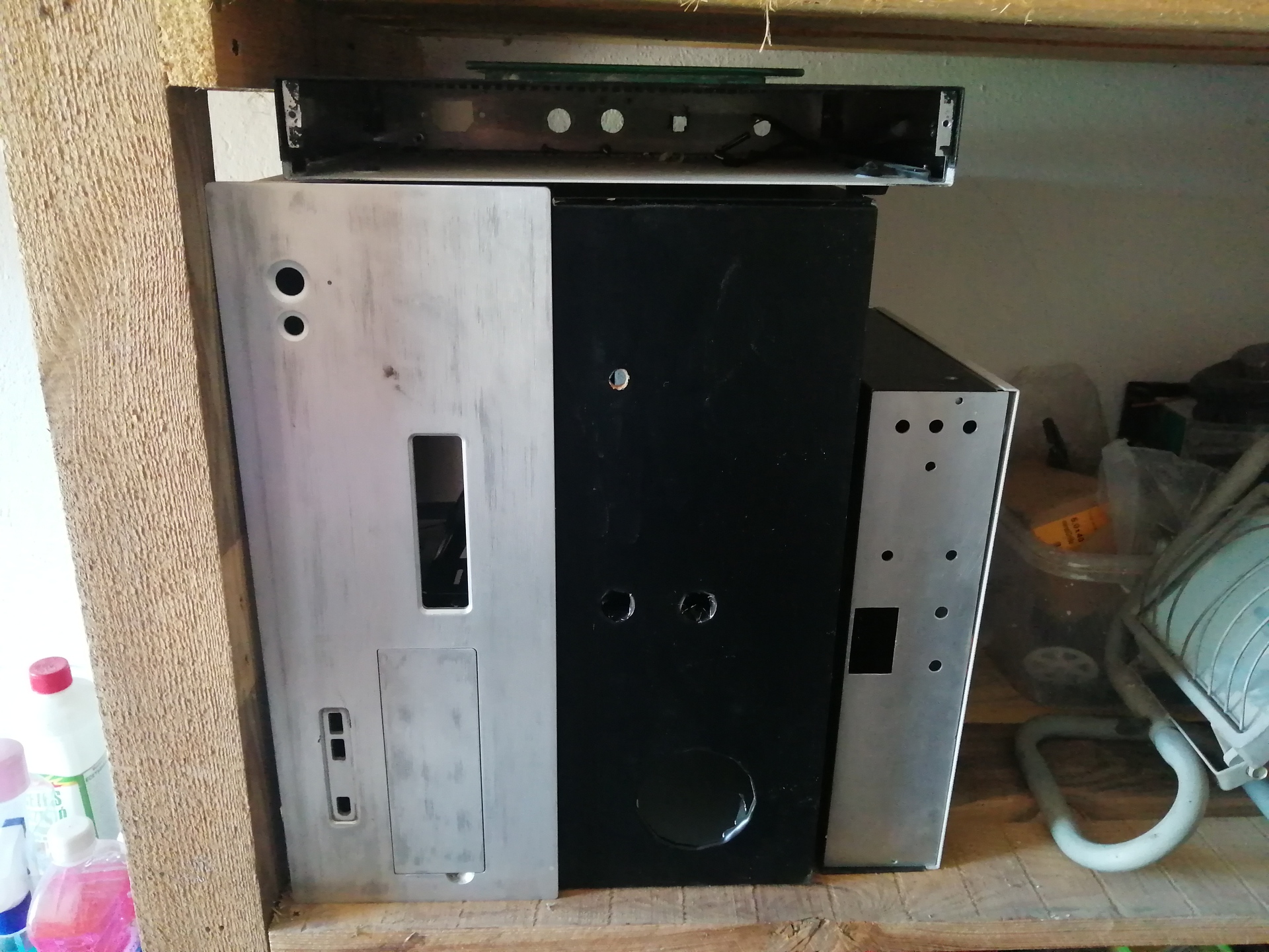 A fúrógép akkutartója üres, az eredeti NiCd akkuk már rég 18650-es Li-ion akkura lettek cserélve, mára azok is beadták a kulcsot. De a gép, és a tokmány még mindig hibátlan. MP3 lejátszó, hálókártya, új optikai enkóder, tárcsával, Bosch nyomásszenzor, stb. Jó állapotú HP számítógép ház, talán ebben volt a DVD író is.