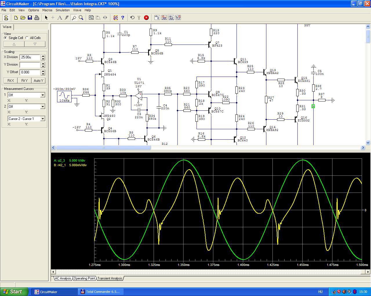 ![]() TJ. bázis-emitter átmenetKénytelen vagyok idejönni.mcc: A gyakorlatban úgy néz fest a dolog, hogy Q1, Q2 9mA-es nyugalmi áramához a BC747C (D1) bázis-emitter átmenetén 371uA áramnak kell folynia, a BC557C-n (D2) 447uA-nek. A CM szerint ez az áram 1.96mA mindkét, diódaként bekötött tranzisztoron. shany: Nem értem mi a problémád ezzel az előfeszítéssel. Hogy hol használtak ilyet? Én használtam régen többször pl. RIAA korrektorokban és teljesen bevált. Mi az előnye? Az, hogy két azonos típusú BJT pontosabb előfeszítést ad, mintha helyette diódát használnék. A másik, hogy ezeket egymással szembe fordítva össze lehet ragasztani a lehető legjobb termikus együtt futás érdekében (amolyan tanyasi tranzisztor array ).Elolvastam a linket, de nem értem mi a "poén" benne.