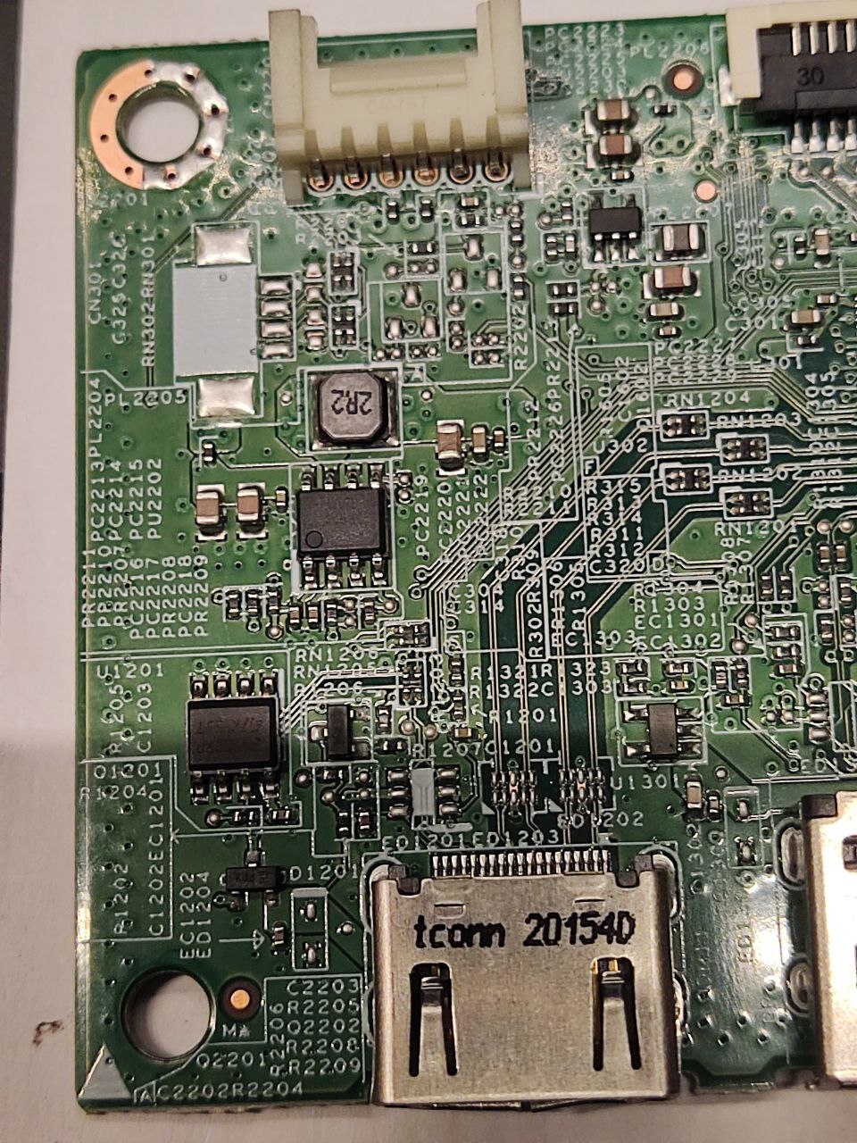 Szia bbb,sajna nincs szkópom,de ha jól emlékszem,nem volt hang opció a menüben. Erre a CN301-es 4 lábú helyre gondolsz a HDMI bemenet fölött? Lehet,hogy addig nem is teszi be a menübe,amíg nem érzékeli a fejhallgató kimenetet,ha ez annak a helye.Alatta egy A1530-as kódú SMD IC van,ami inkább a táp felől jövő fehér 6lábú bemenethez kapcsolódik,de csak találgatok.Alatta egy 24C02 IC van,az bármit tárolhat,de nem hang IC.