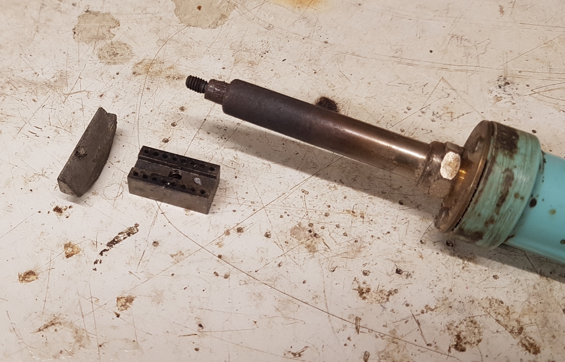 Csak mellékesen kérdezem, minek kivenni egy tüskesort, hogyan tud az elromlani? Távolról sem példaértékű, sőt inkább azt igyekszem megmutatni, hogy kezdetleges módszerekkel is lehet hasznos segédeket gyártani. A képeken a kattogós Wellerem van, aminek az egyik hegyérre menetet vágtam (tetem ezt kb. 30 éve, és azóta is használok esetenként). Erre tudok különböző adaptereket feltenni, amiket vörösrézből csináltam. A pengeszerű betétem használom a legtöbbet, ez egy nagyon praktikus alak.