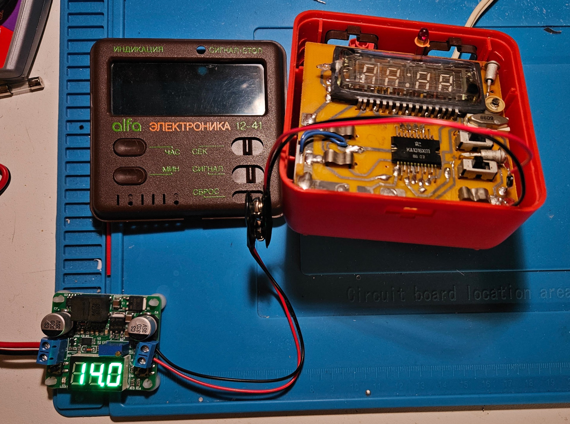 Legalább 11V kell neki ahogy nézem. Elővettem a DC-DC boostert, betekertem úgy hogy C4-en 12,50-et mutasson, ezzel pöpecül megy már két órája, csakhát ez is ugye a 220-ból indul el (egy bolhapiacon kukázott 12V 2A-os router tápon keresztül , ahogy a mellette lévő rádión hallatszik, az is erősen kondicsere-érett )Hagyom vagy 12 órát sötéten ketyegni, aztán meglátjuk. De ha beválik, akkor még mindig kérdés hogy mi a túróval fogom meghajtani?? Két, korábban tárgyalt riasztó távirányító elemből (23A/MN21, sorba kötve) simán lesz 24, amiből egy L7815 csinál 15-öt, azt átküldve egy diódán ott is vagyok a 12,5V környékén (2V a voltage dropja). Ez eddig szép de ez egy zárt áramkör aminek mellékesen van egy 15V-s kimenete, nem? mert akkor simán megeszi az elemet pár nap alatt, amíg várunk az áramszünetre... Ja és amúgy annyi helyem sincs hogy egy 9V-os elem beférjen az óra házába, ezért a vonzódás a távirányító elem iránt. Az gondolom mégse megoldás, hogy három pici 3,7-es Li-ion zacsit tegyek bele BMS lapkával... kicsit overkill és hő/élettartam para van. ps. szép ez a két nyák a fotón egymás mellett... van köztük vagy negyven év