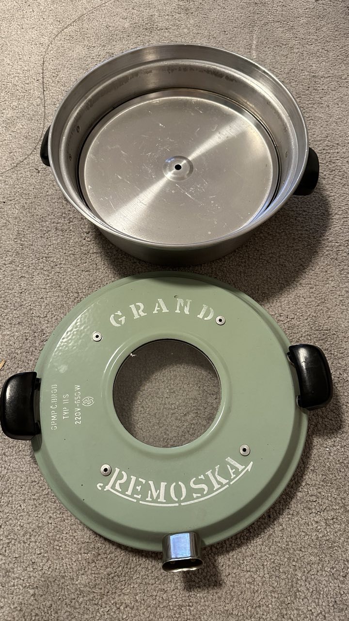 Nagyszüleimnek modern "Remoska" van, nem tudni, hogy tényleg az-e vagy már csak annak nevezik. A modern verziónak a kábel csatlakozóján van hőfok tekerő és van rajta egy visszajelző is, maga a készülék fekete színű.